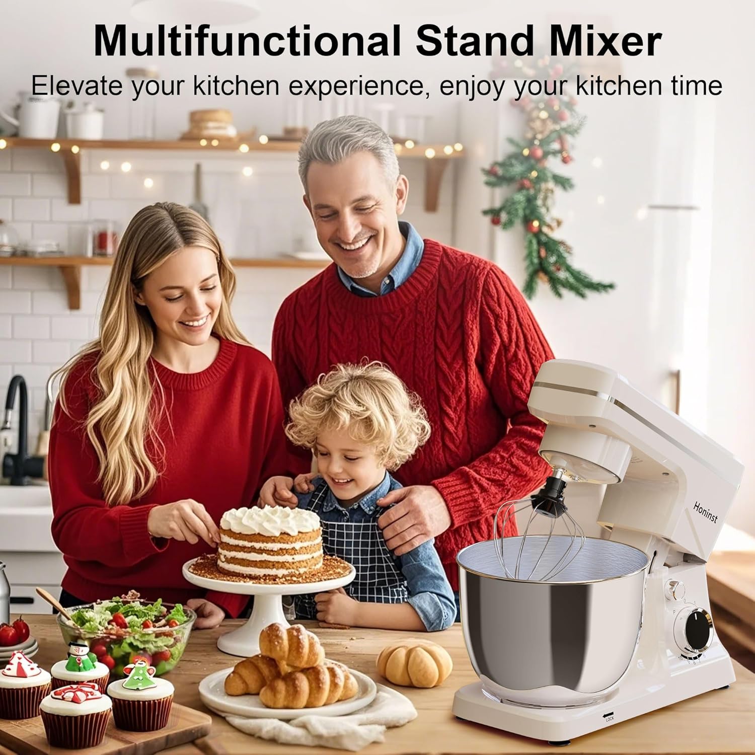 - 10+P Speed & 8-In-1 Splash Guard: Honinst stand mixer features multiple speeds settings, offering precise control for mixing, kneading, and whipping, making it ideal for baking bread, cakes, and cookies. Upgraded splash-proof cover with multifunctional features --- measuring cup and stick, dough cutter, egg white separator and toothed cutter, for food preparation