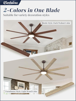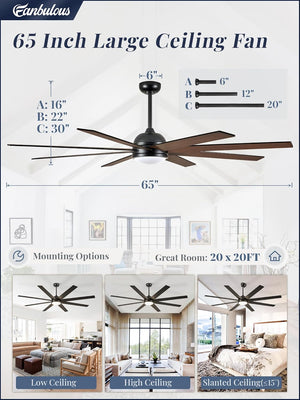 - 65 Inch Large Ceiling Fan: The living room ceiling fan has 2 colors on each blade - a classic black finish on one side and a warm wood grain tone on the other. Perfect for blending into modern or farmhouse style settings. With a 65-inch diameter, the modern ceiling fan is ideal for rooms up to 20ft.×20ft, suitable for living rooms, great rooms, covered patios and porches(Not to expose to rain directly)