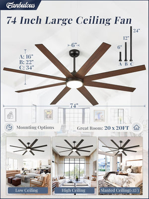 - Versatile Installation: The outdoor ceiling fans come with 6”, 12” and 20” downrods. The 6” downrod is perfect for ceilings up to 8 feet high, while 20” is suitable for 10 feet. You can also use the 20” downrod to enhance wind speed and air circulation. Moreover, the high ceiling fan can be angle-mounted (Max 15°)