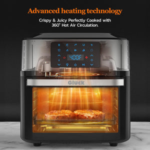 - ★【10-in-1 Versatility】The Gluck air fryer oven is your all-in-one kitchen solution, offering 10 preset programs to fry, bake, roast, dehydrate, reheat, and toast. With versatile accessories included, you can effortlessly cook whole chickens, fries, steaks, pizzas, kebabs, and more, all while saving counter space by replacing multiple appliances.