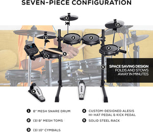 - Premium Seven-Piece Drum Set - 8" mesh snare drum and (3) 8" mesh toms, (3) 10" cymbals and custom-designed Alesis hi-hat pedal & kick pedal