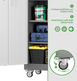 - 【Swivel Wheels with Lock】 Metal storage cabinet with wheels has 4 lockable wheels,you can move them around as needed and the casters and wheels work great on all the different surfaces,besides the wheels can be locked and you can fix the cabinet where you want to place.