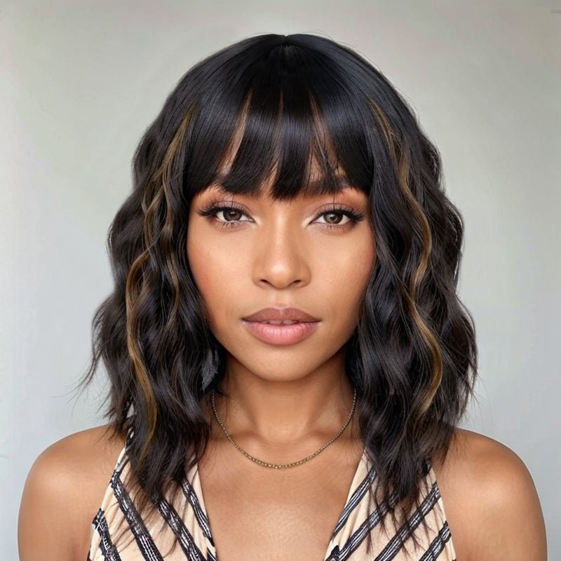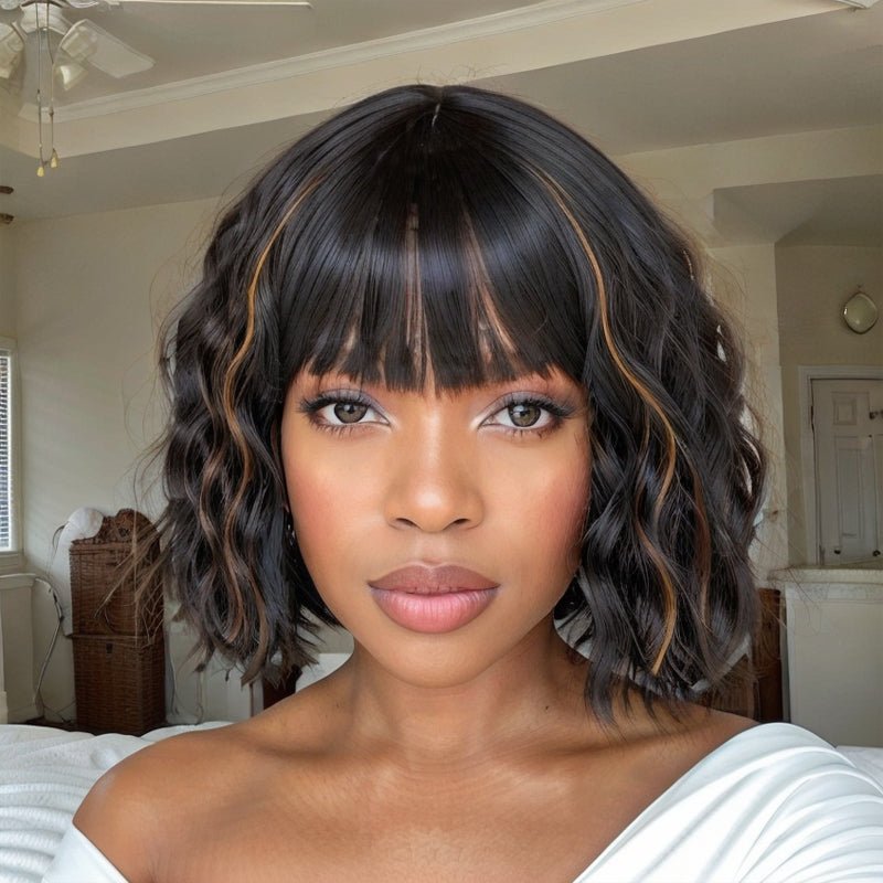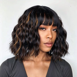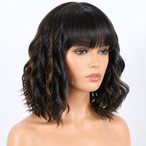Bob Wigs With Bangs Black Mixed Brown Short Wavy Wig