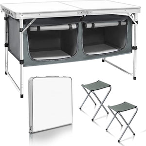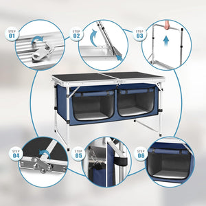 - Folding camping table sets up in seconds, providing a sturdy surface for meals, games, or other outdoor activities.Hold up to 66lbs (30kg); Zippered cartons offer Large storage space to protect your food from the bugs and animals