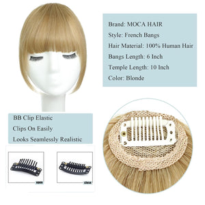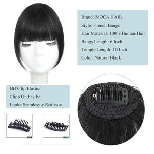 - Clip In Bangs Style: French Bangs. Free Style, Faux Bangs Clip Human Hair Can Well Modify Various Face Shapes Also, French Bangs Have Perfect Thickness To Cover Your Forehead Without Worrying About Wispy. The Hair Temples On Both Sides Can Correct Different Facial Contours. You Can Cut The Bangs To Any Length As You Like To Fit Your Face And Your Hairstyle. Become Cute And Sexy Attractive In One Second When Dating/Party/Wedding/Daily Use.