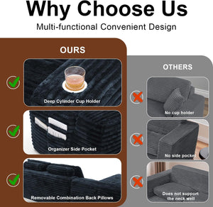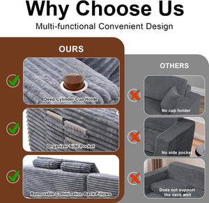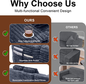 - 【Lazy Living Ready Design】Keep Essentials at Arm's Reach. Dual cup holders (secures 32 oz tumblers); Hidden corduroy pockets (fits 12.9" iPad + remotes); 6 detachable cushions (3 lumbar + 3 bolster pillows) for full chaise support. No more couch acrobatics - everything stays organized!