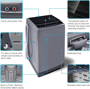 - With the transparent lid design, this washing machine allows you to see and monitor the water and washing conditions. Featuring a durable rust-resistant steel inner tub, lint filter, water inlet and drain pump which allows you to easily drain out dirty water. In addition, this portable laundry washing machine has an LED display that shows the time left to finish.