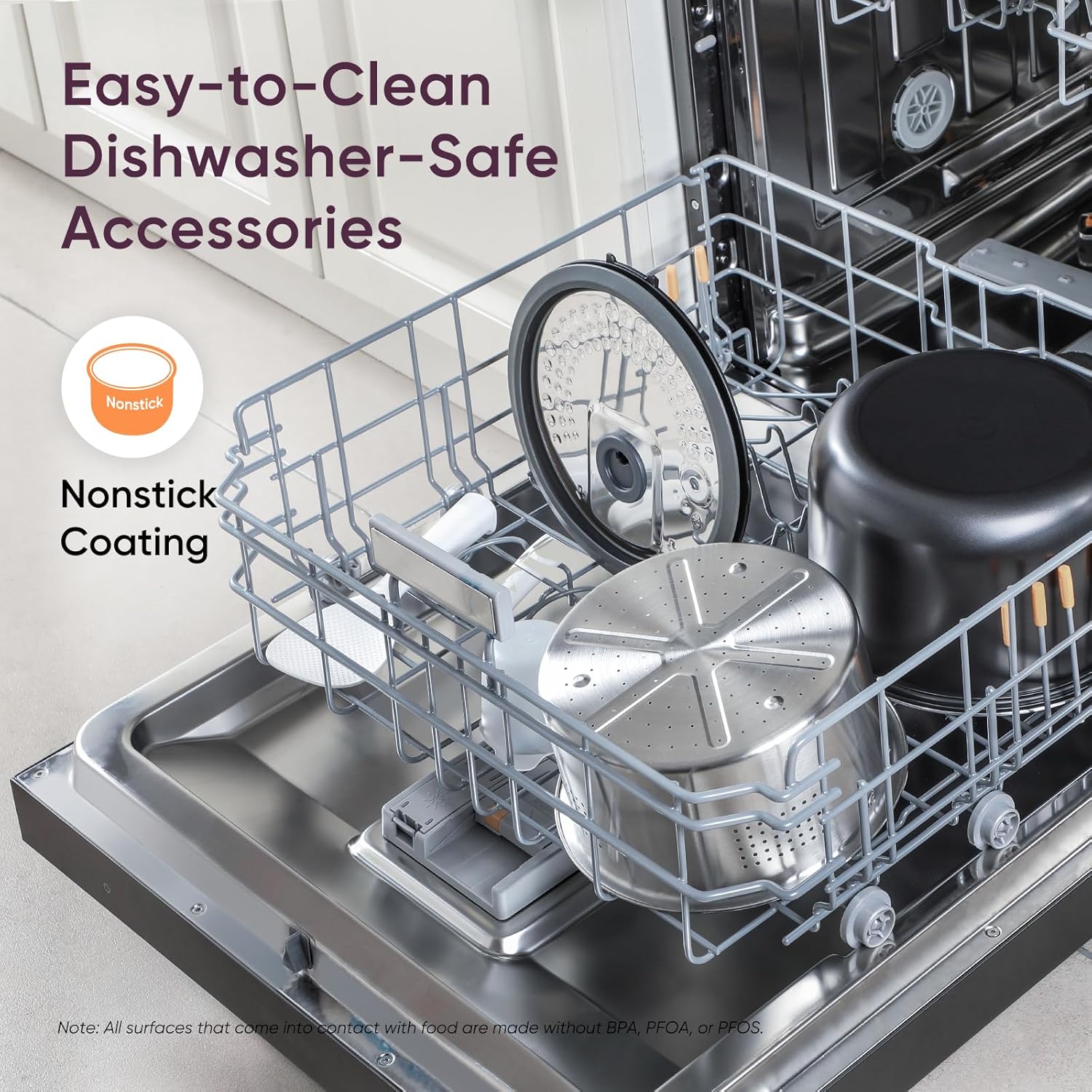 - 𝗘𝗮𝘀𝘆 𝘁𝗼 𝗖𝗹𝗲𝗮𝗻: All accessories including non-stick ceramic inner pot and removable lid are dishwasher-safe