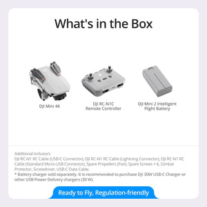 | Included Components | DJI Mini 2 Intelligent Flight Battery × 2, DJI Mini 4K × 1, DJI RC-N1 RC Cable (Lightning Connector) × 1, DJI RC-N1 RC Cable (Standard Micro-USB Connector) × 1, DJI RC-N1 RC Cable (USB-C Connector) × 1, DJI RC-N1C Remote Controller × 1, Gimbal Protector, Propeller, Propeller Holder, Screwdriver, Shoulder Bag × 1, Spare Screws × 18, USB-C Data Cable × 1 |