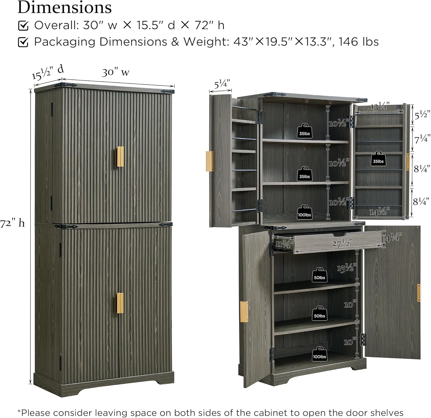 | Special Feature | Fluted Panel, Door Shelves, Adjustable Shelves, Mid Drawer, Magnetic Catches |
