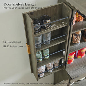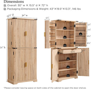 - Ample Storage Capacity: Standing at 72"H × 30"W × 15.55"D, this cabinet offers abundant storage for all your needs. It includes 6 spacious shelves (4 adjustable), 8 door racks (2 adjustable), and a smooth-gliding mid drawer. The top door is equipped with a magnetic locker for convenient closure.