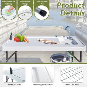 - Practical Details Design:Quick-connect faucet that can be hooked to a garden hose easily. Besides, our fillet table for fish is equipped with a stable grid rack and an extending sprayer to provide water pressure where you need it. Our table features scale on the side of table as reference for specialty and customized fillets. It also comes with three knife groove and a knife.