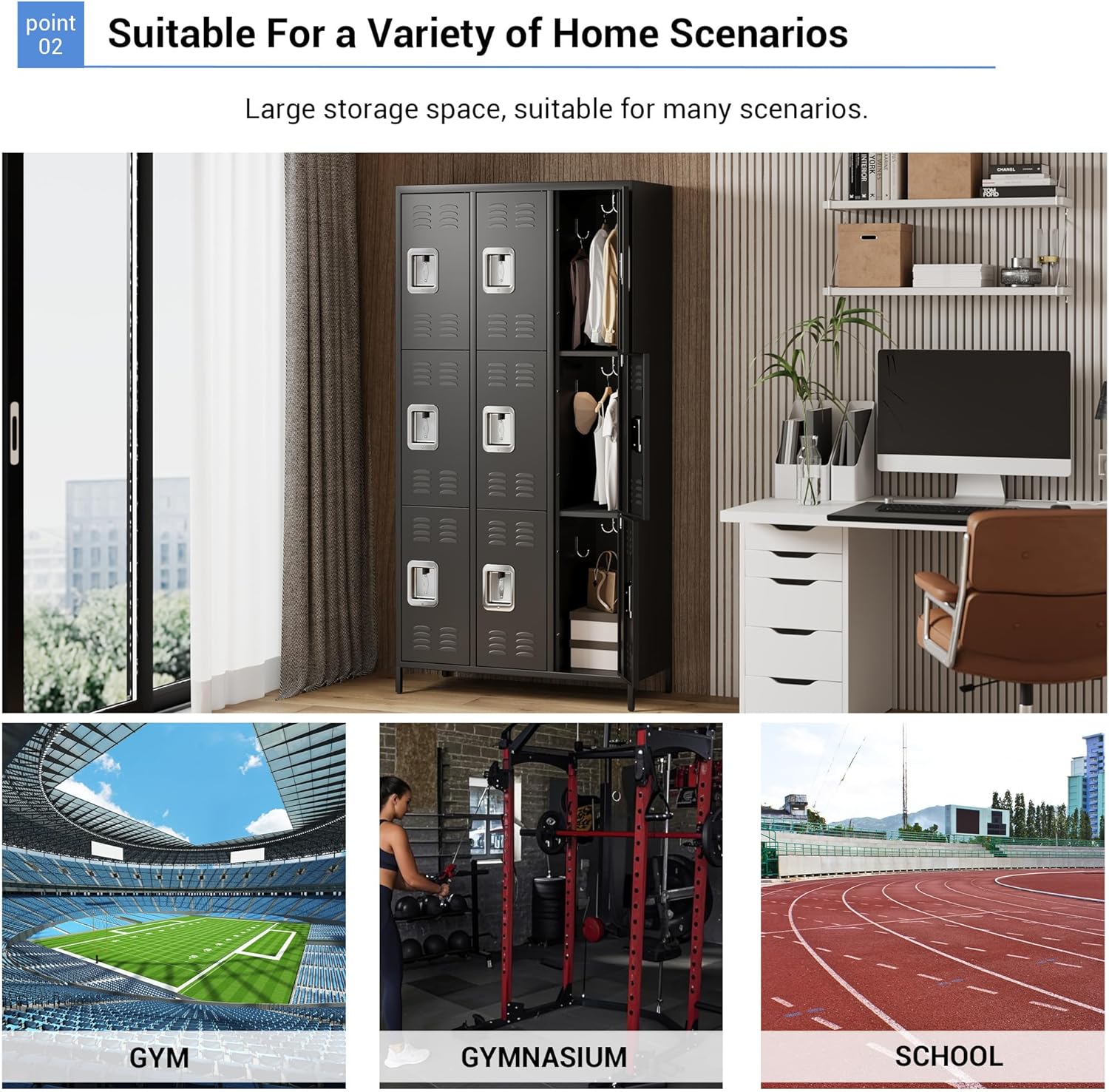 - 【Spacious Compartments for Storage】Measuring 72"H x 15.7"W x 35.4"D, this 6-door locker features six separate compartments that efficiently store items of various sizes. It’s perfect for organizing bulky equipment, personal belongings, or office supplies at places like schools, gyms, or employee lockers.