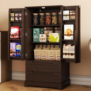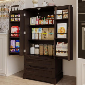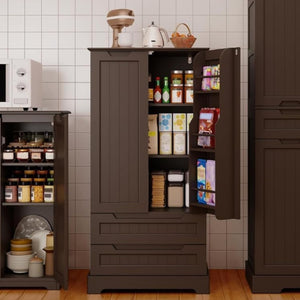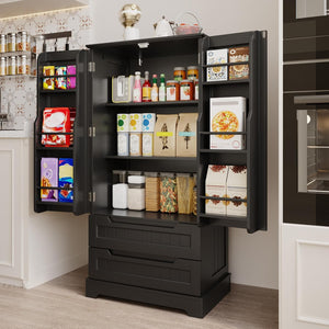 - Spacious Storage Capacity: This generously sized pantry cabinet is designed to cater to your storage needs. With two side door shelves and two drawers, there’s plenty of room for organizing spices, canned goods, and dinnerware. Plus, the top surface can be used to display a plant or store cookbooks, helping to keep your countertops clutter-free