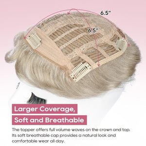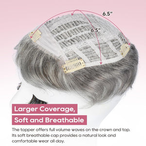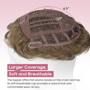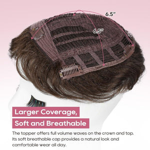 - Spacious Coverage: Featuring a 6.5"x6.5" base design with airy bangs(Sideburn hair length: 4.5 inches, bangs length: 3.5 inches, back hair length: 4.5 inches), this topper offers extended coverage to conceal frontal hair loss while delivering a face-framing look with perfectly texturized ends that blend seamlessly with your natural hair