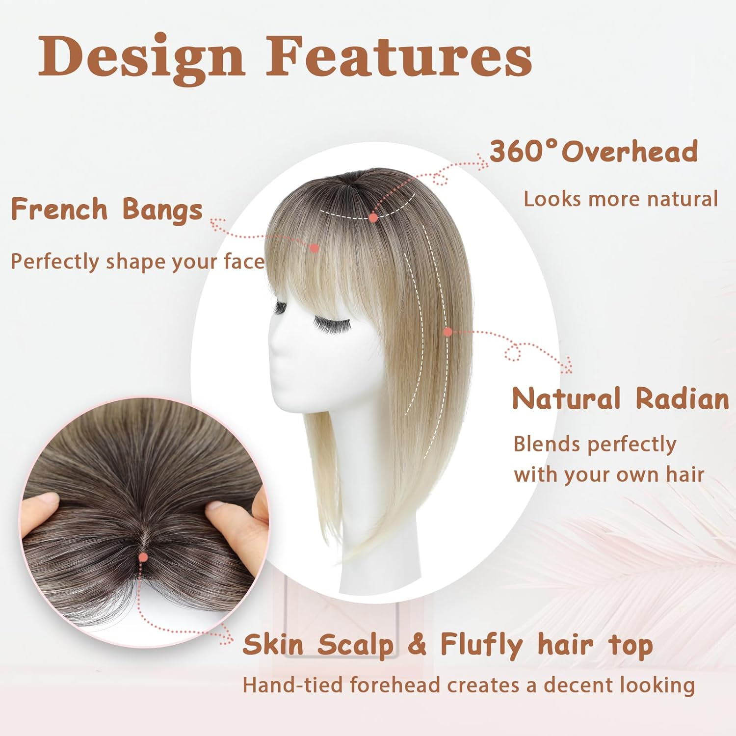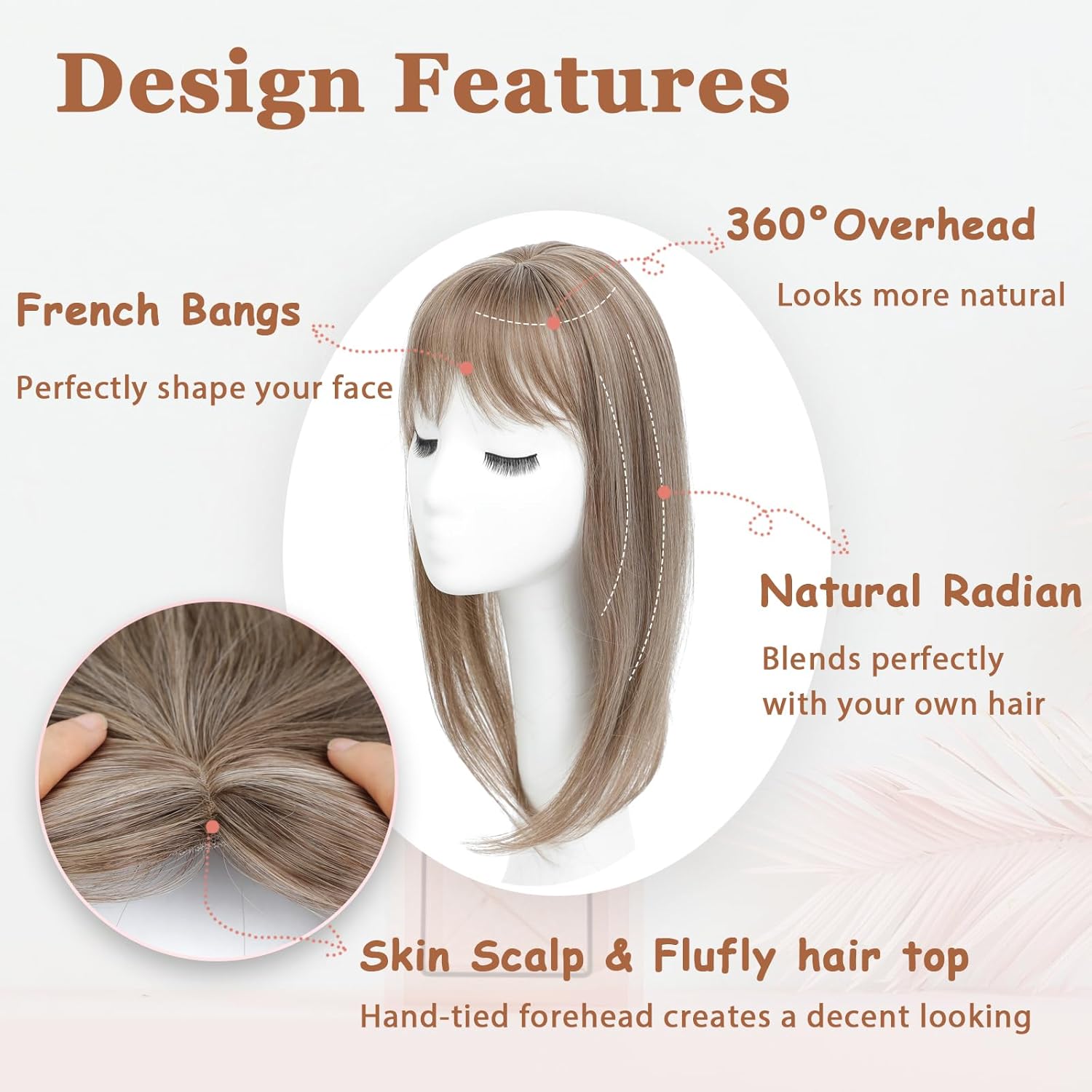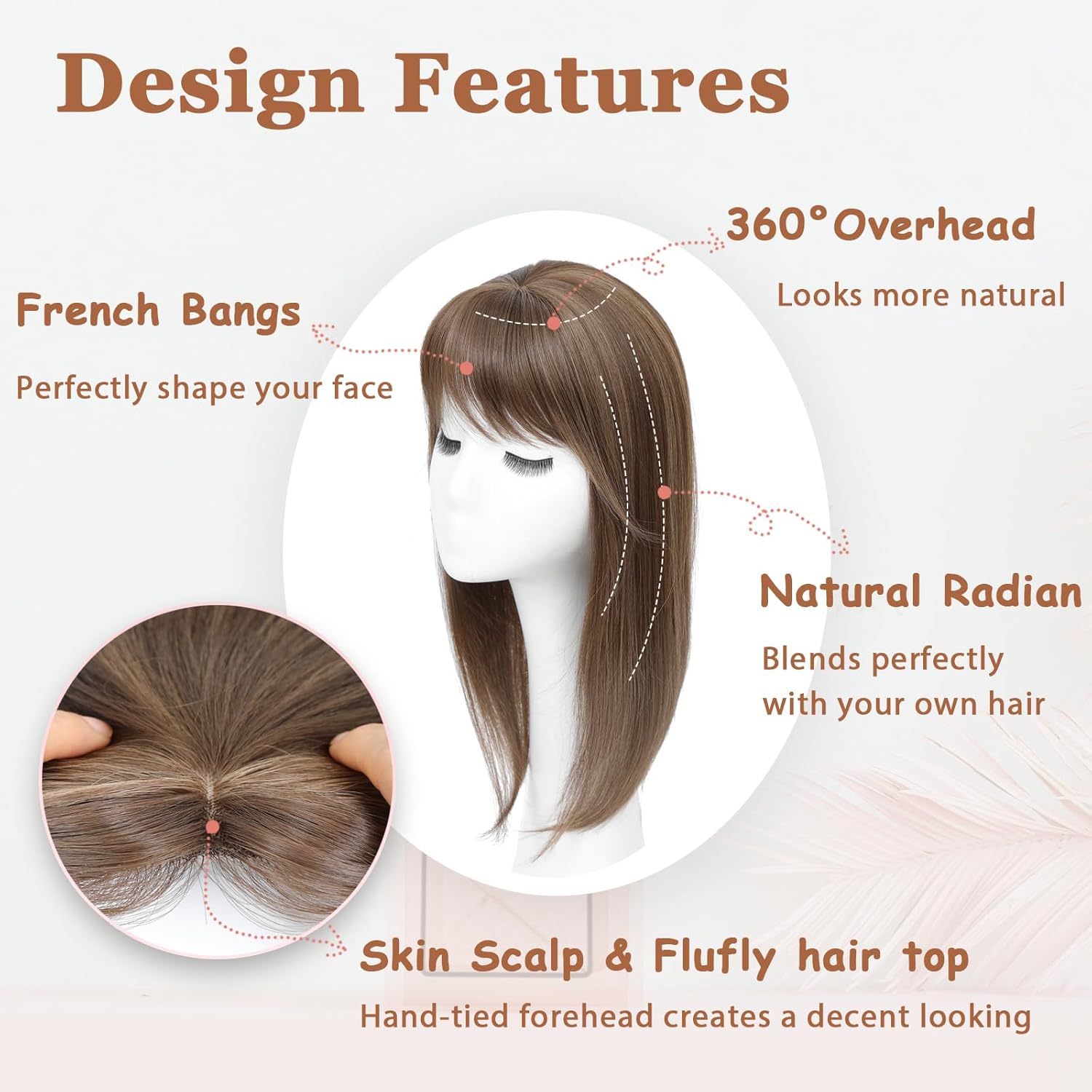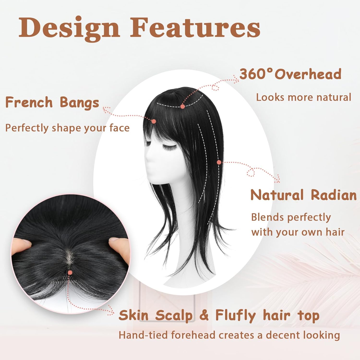 - Instant Volume and Coverage: This lightweight 100% human hair topper weighs 60 grams with a 2.8x3 inch base, providing instant fullness and coverage for thinning hair and shaping the face with natural-looking bangs.