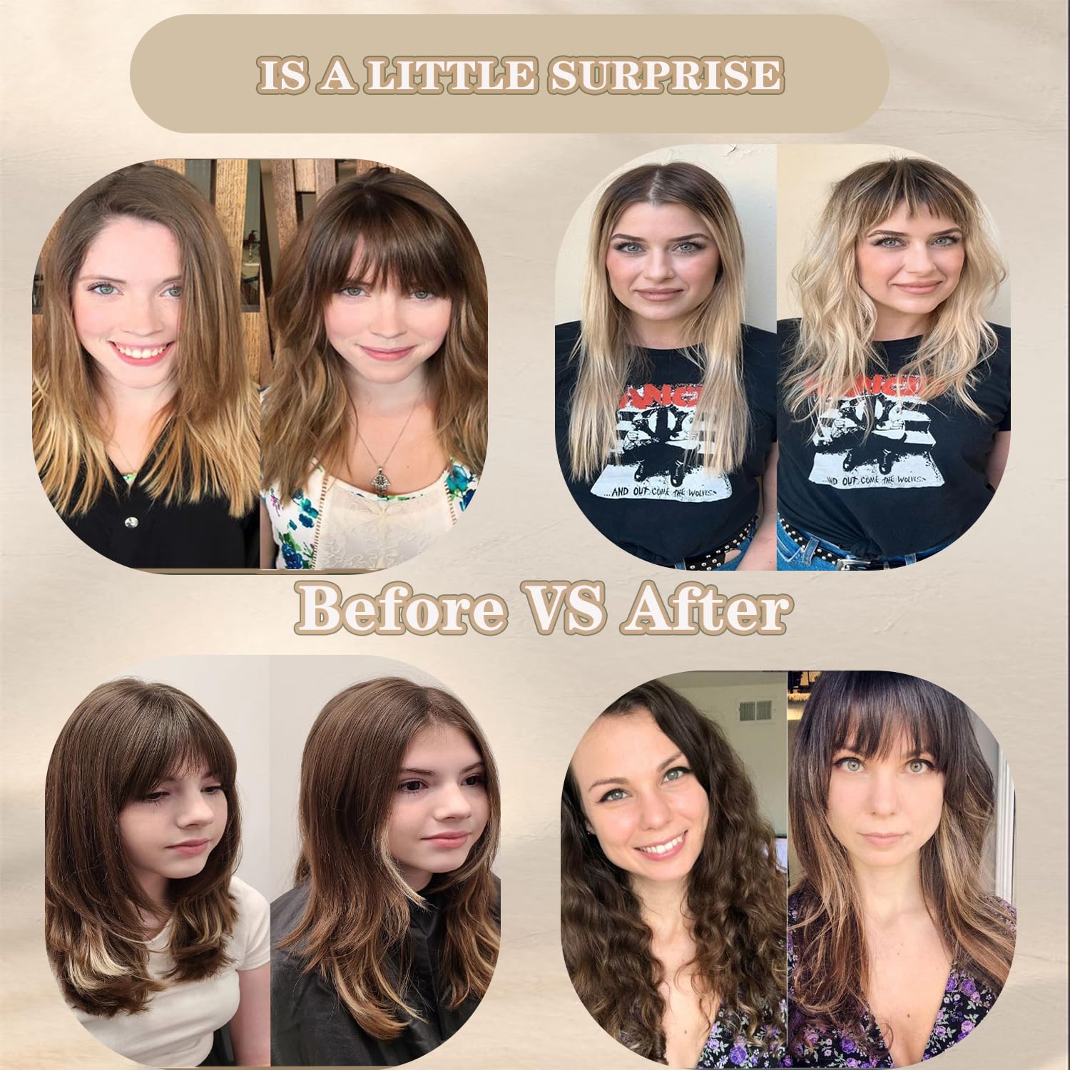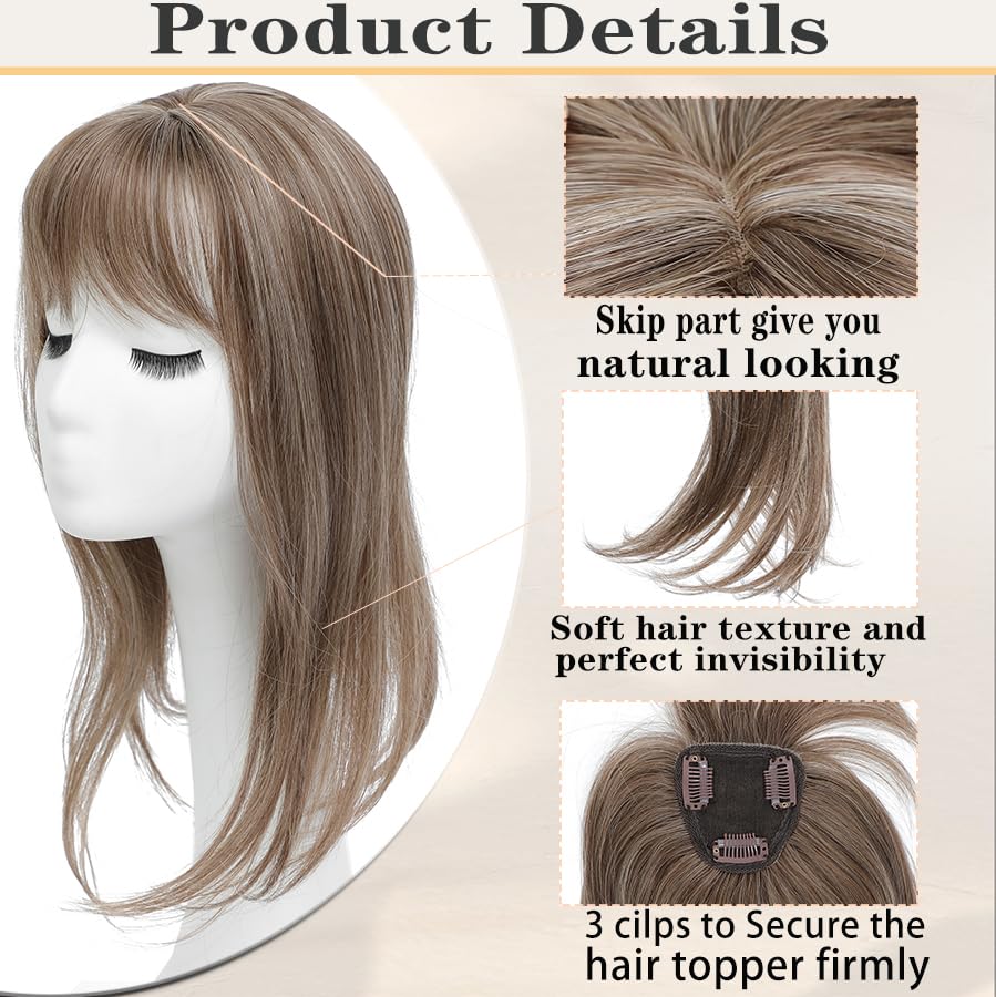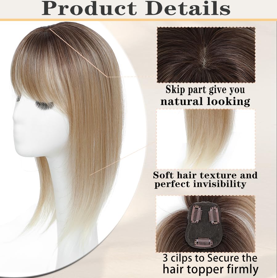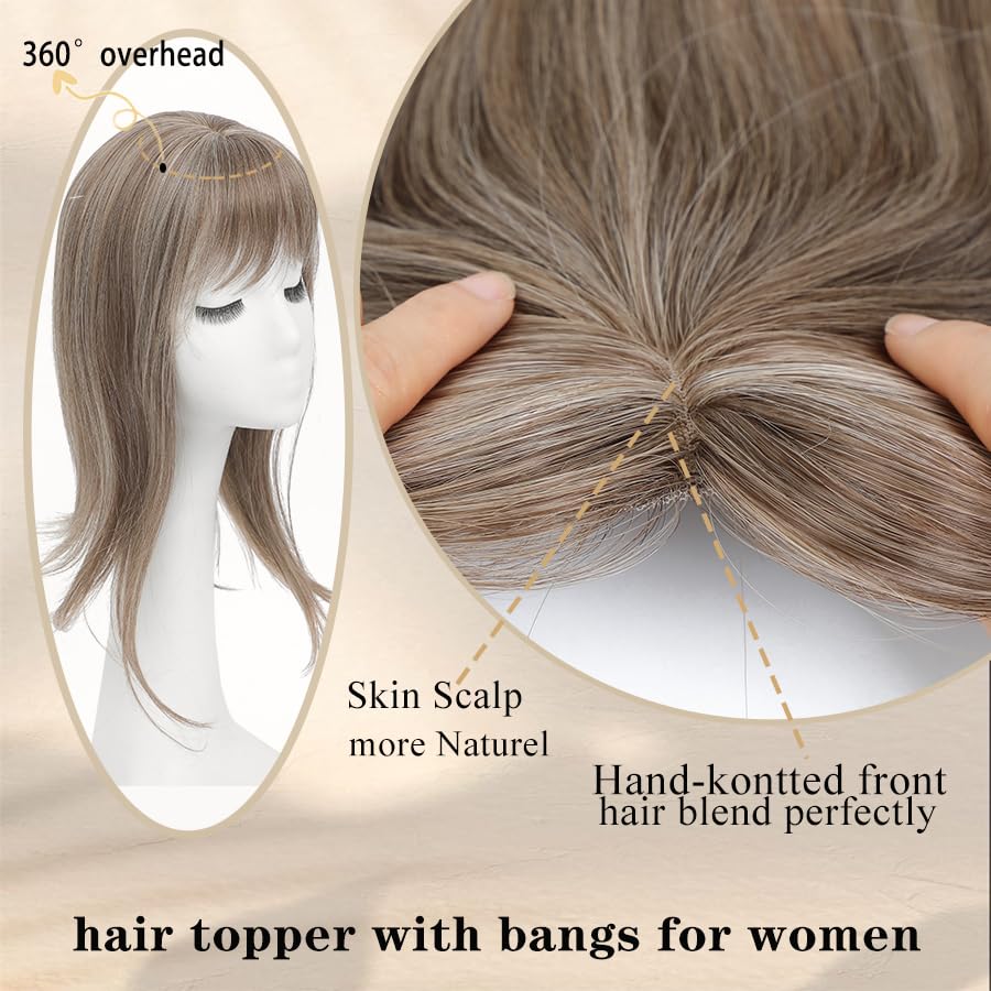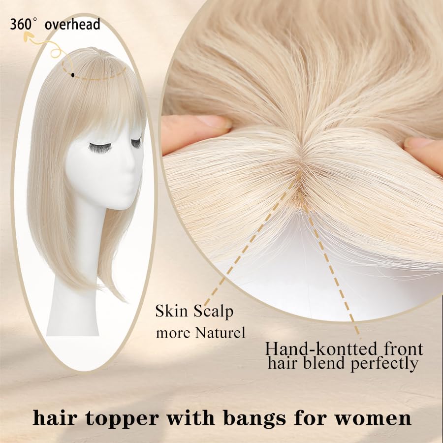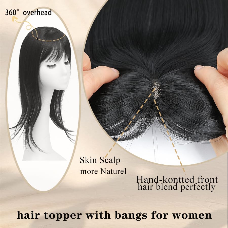 - Natural Look and Feel: This hair topper is crafted with premium human hair fibers that mimic the texture and movement of natural hair. The French bangs and skin-like cap construction create a seamless, undetectable blend with your existing hair.