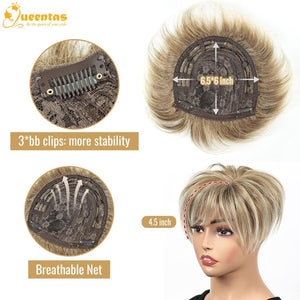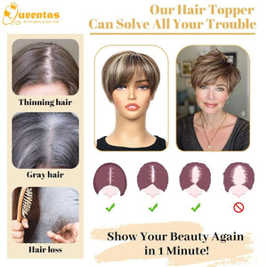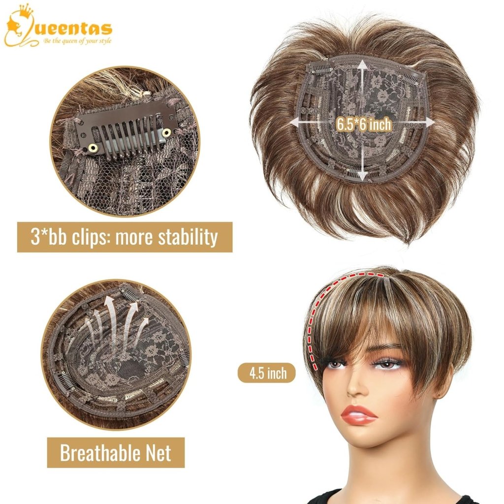 - Multi-function Hair Pieces: Hair toppers for women is a solution for women with thinning hair. Hair topper with bangs hair clip will add hair volume, cover gray hair & lose hair,frame the face, etc. Bring new fashion hair style and transform your look in 1 minutes. It just like your own hair,give you back confidence and charming.
