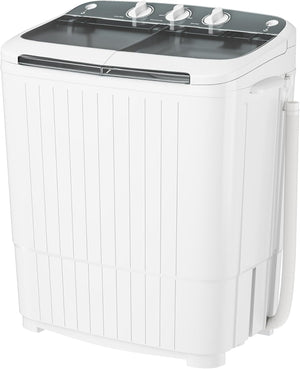 - 【Twin Tub Design】:Twin tub washer machine is designed with washing tub and spin tub. A filter net on the side of washer tub for quick filtering. After washing, just take them out and put them into spin side of mini washer, let spin cover above the clothes to avoid the shaking and spinning.The lid safety switch prevents washer operation when open, ensuring user protection by blocking access to moving parts and preventing water spillage