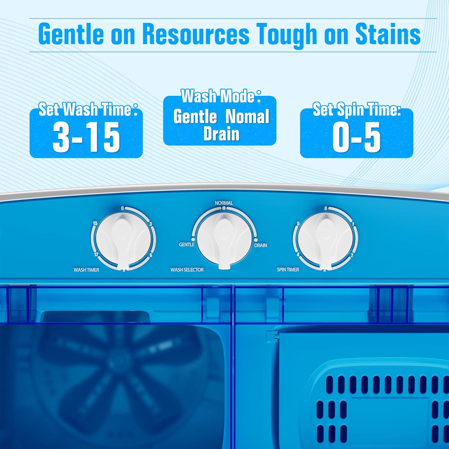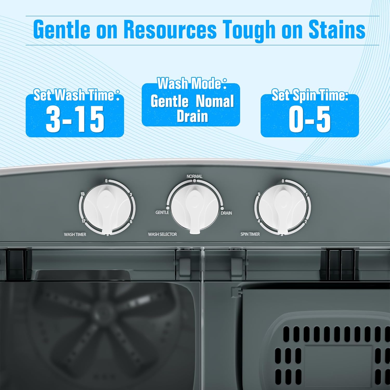 - 【Separate Time Control】:The apartment washing machine controls washing cycle is up to 15 minutes and the spinning cycle is up to 5 minutes each load, finish fast washing and saving you valuable time and. Washing modes: Gentle/Norma/Drain, which is free to set your timer and mode