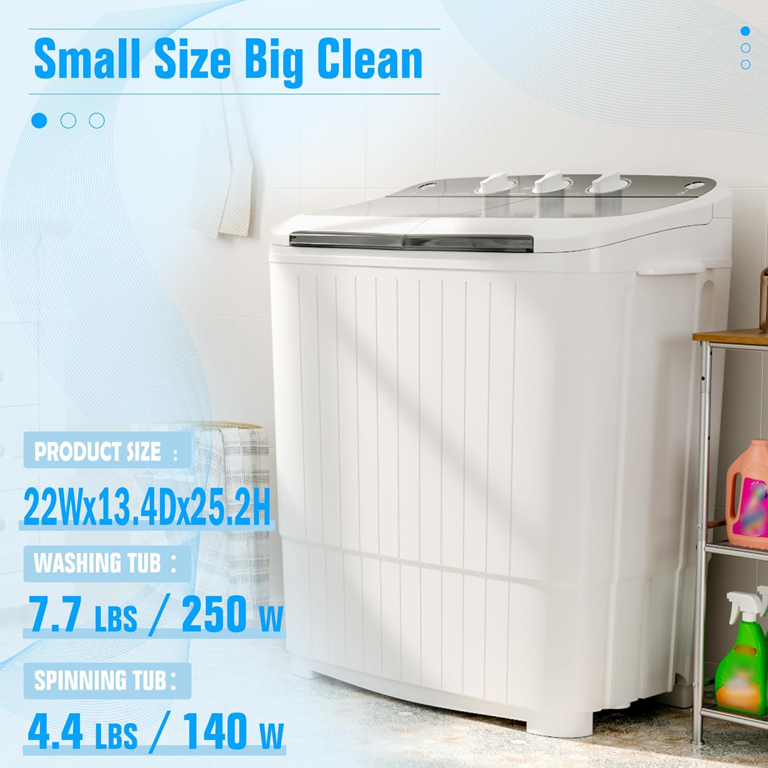 - 【Powerful Performance】: The portable washer features a 1300RPM powerful motor with a max frequency of 60Hz,250W washing power and 140W spinner power, saving much effort on washing. Also, small washing machine combo has a drain pump, which allows you to easily drain out dirty water