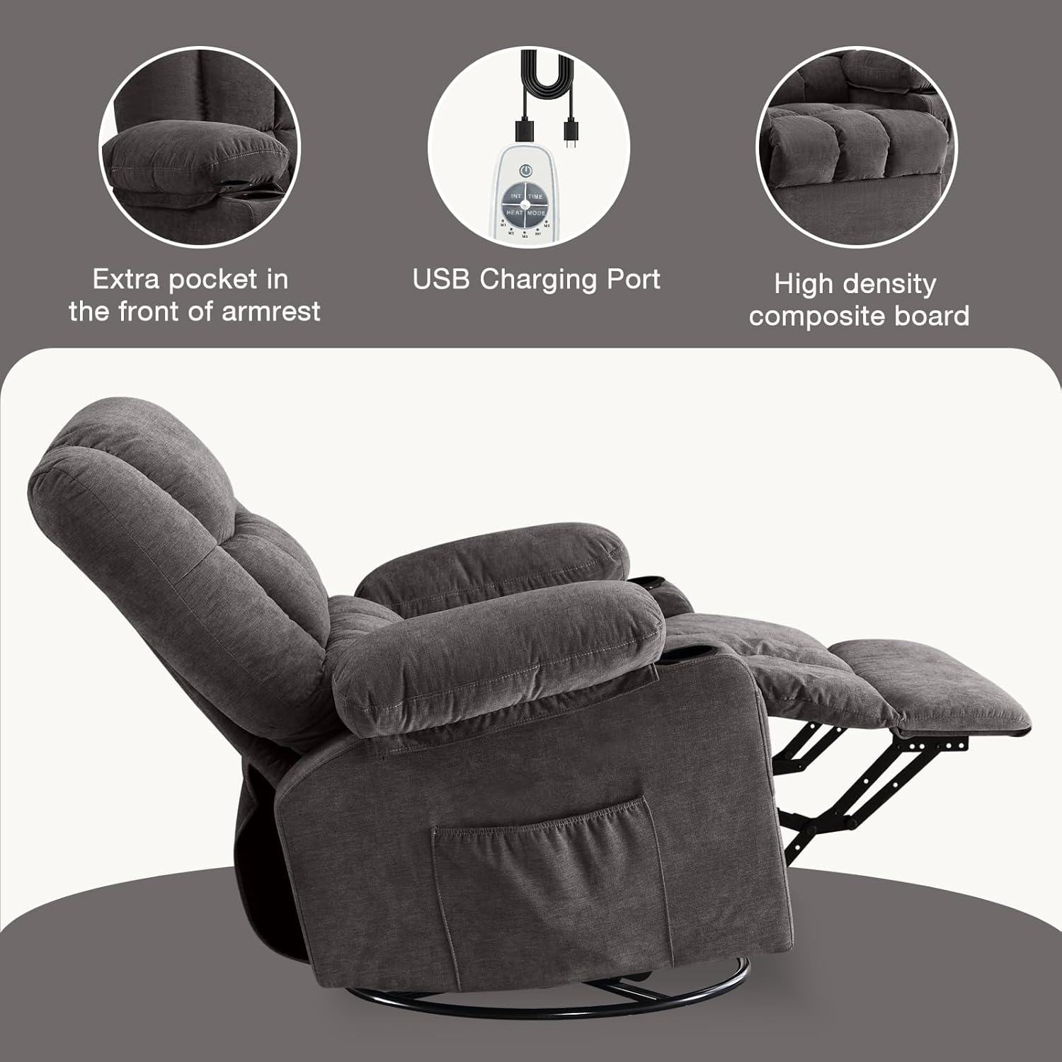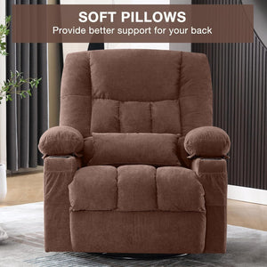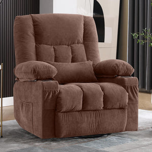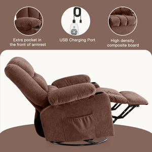 - 【𝗩𝗜𝗕𝗥𝗔𝗧𝗜𝗢𝗡 𝗠𝗔𝗦𝗦𝗔𝗚𝗘 & 𝗛𝗘𝗔𝗧𝗜𝗡𝗚】:This swivel rocker recliner with massage features 8 vibration massage points and 2 intensity options, catering to your unique needs. Targeting calves, thighs, waist, and shoulders, it allows for customized control of massage locations and intensities. Additionally, the waist area includes a heating feature to enhance blood circulation during your massage sessions.