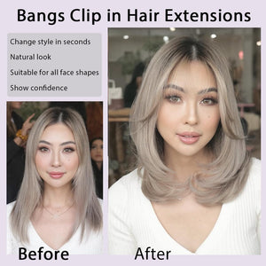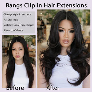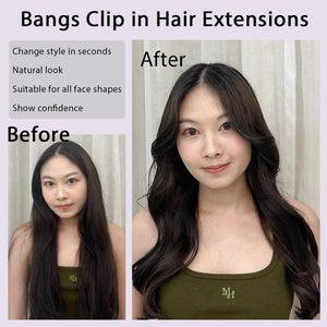 - Multiple Function Clip in Bangs: This clip on bangs are designed with hair topper, not only create a new hair style with curtain bangs, it also solve the problems for women with slight hair loss or thinning hair, add the hair volume, make your hair looks thick and full. Hair toppers with bangs can cover the white and grey hair also, make you looks younger.