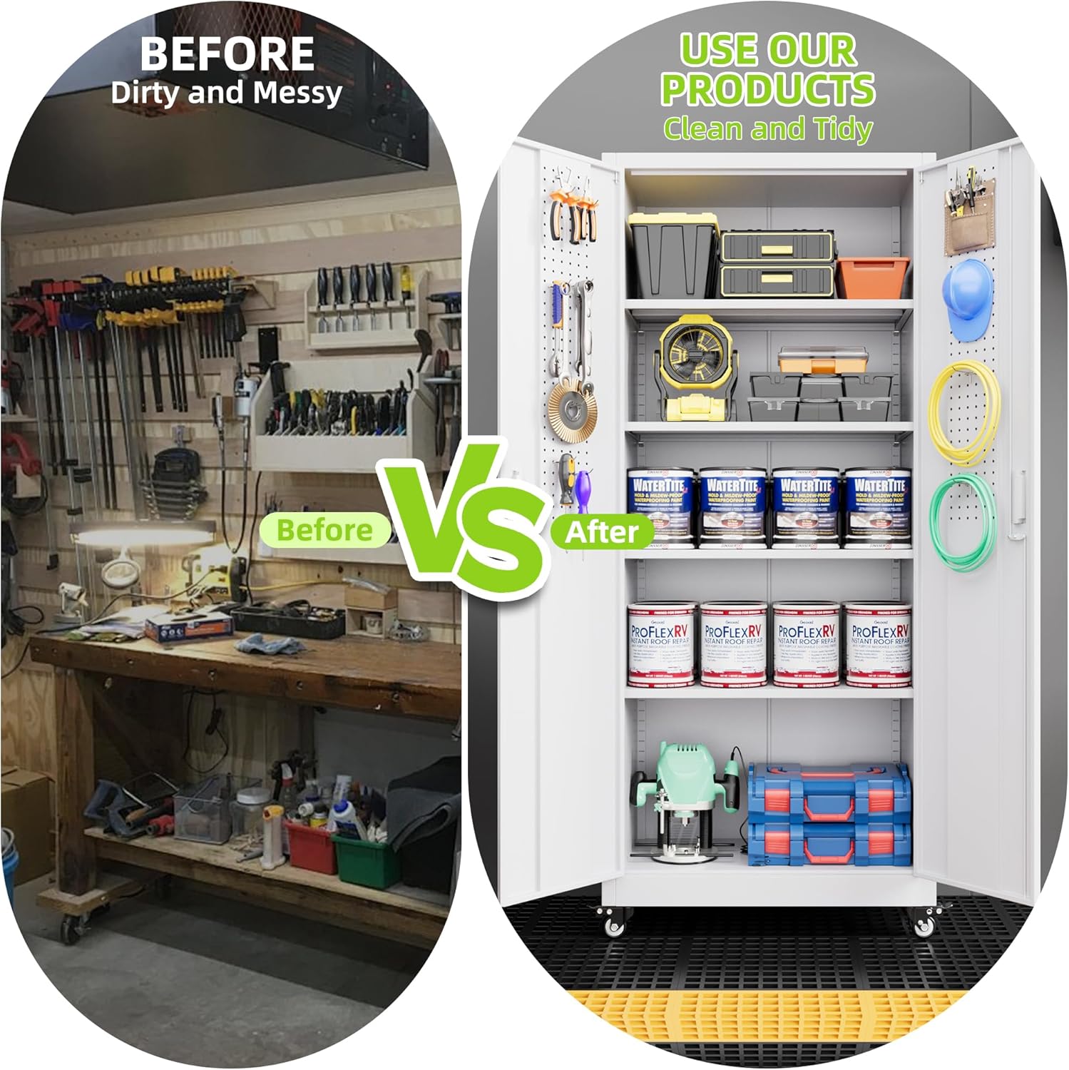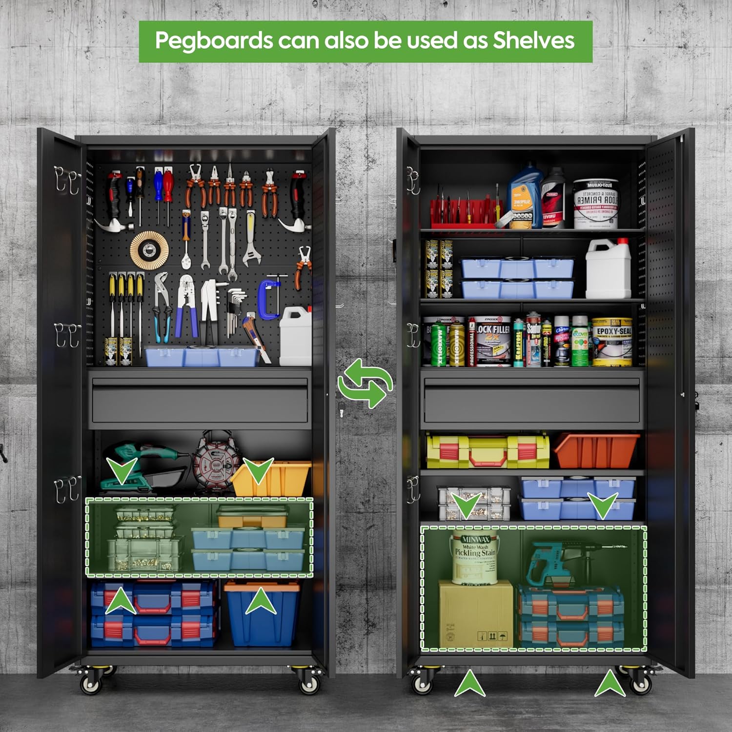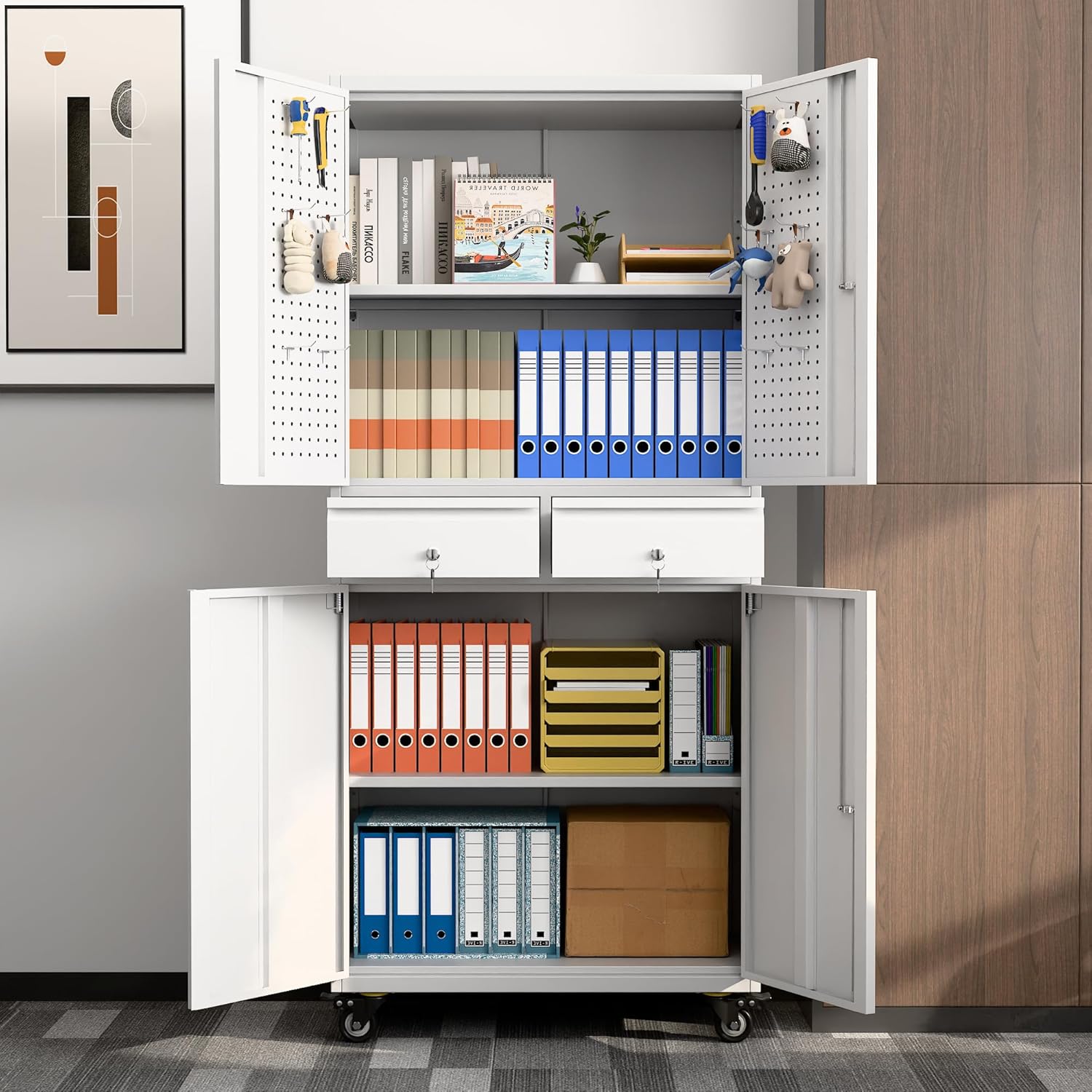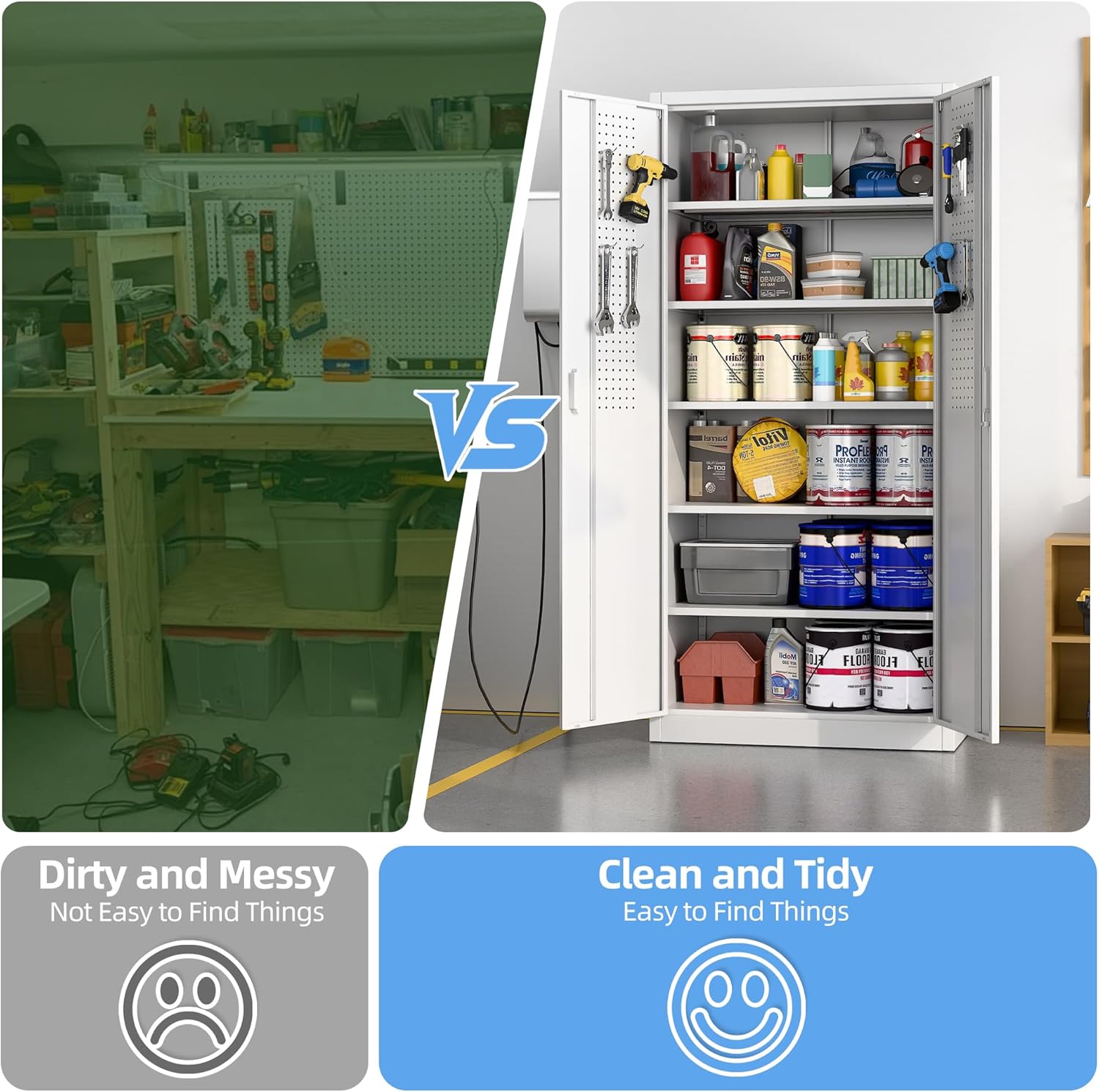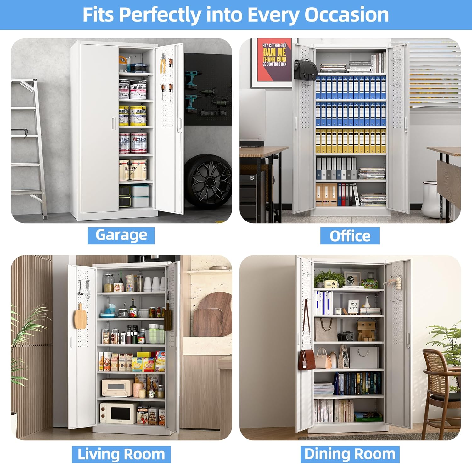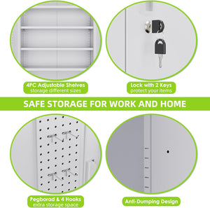- New Upgrade:Metal Cabinet has lots of room to organize your belongings.In order to meet customer storage requirements, the newly upgraded metal cabinet with Pegboard(Including 4 hooks) for storing tools and other items, fully utilizing space