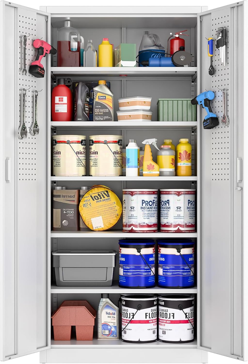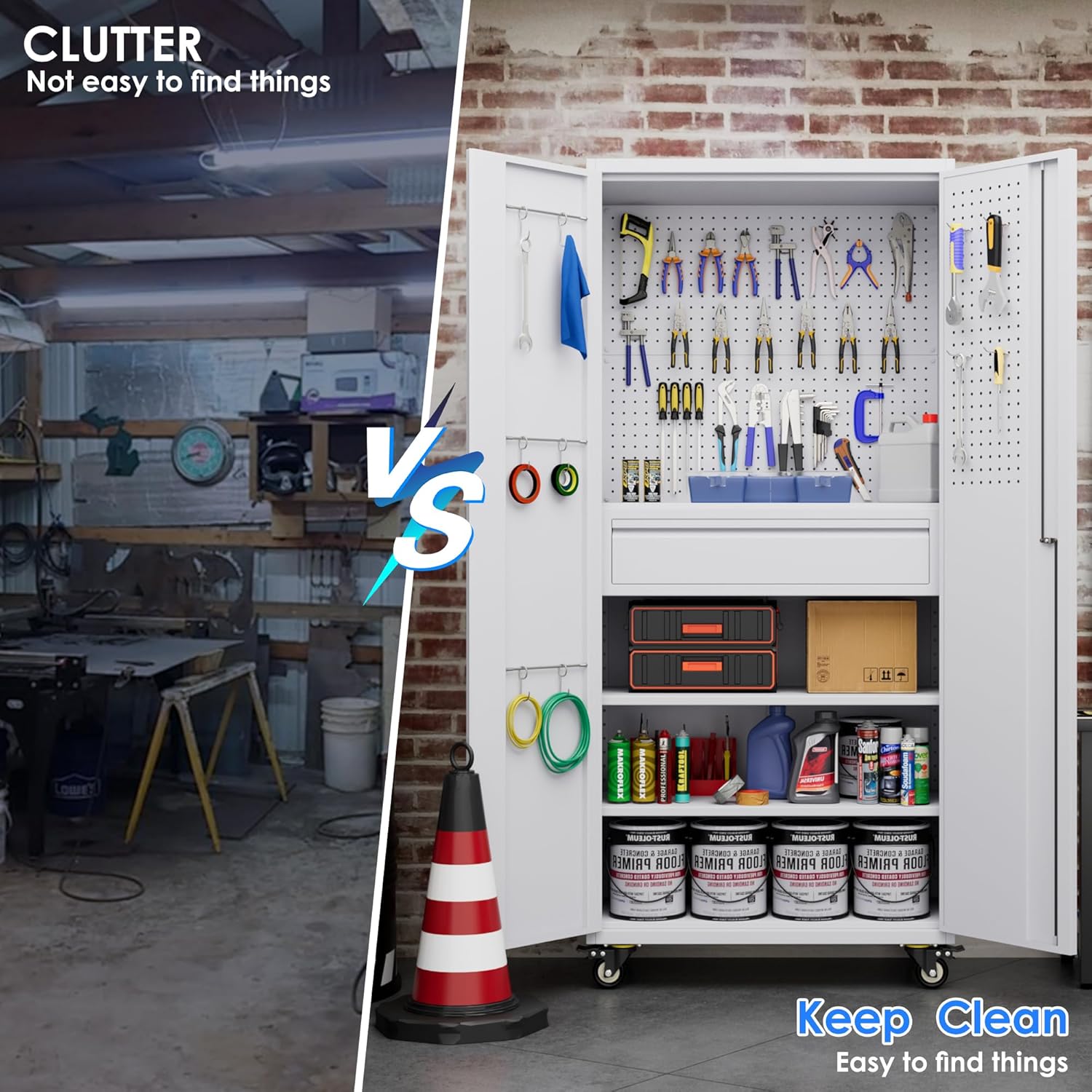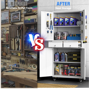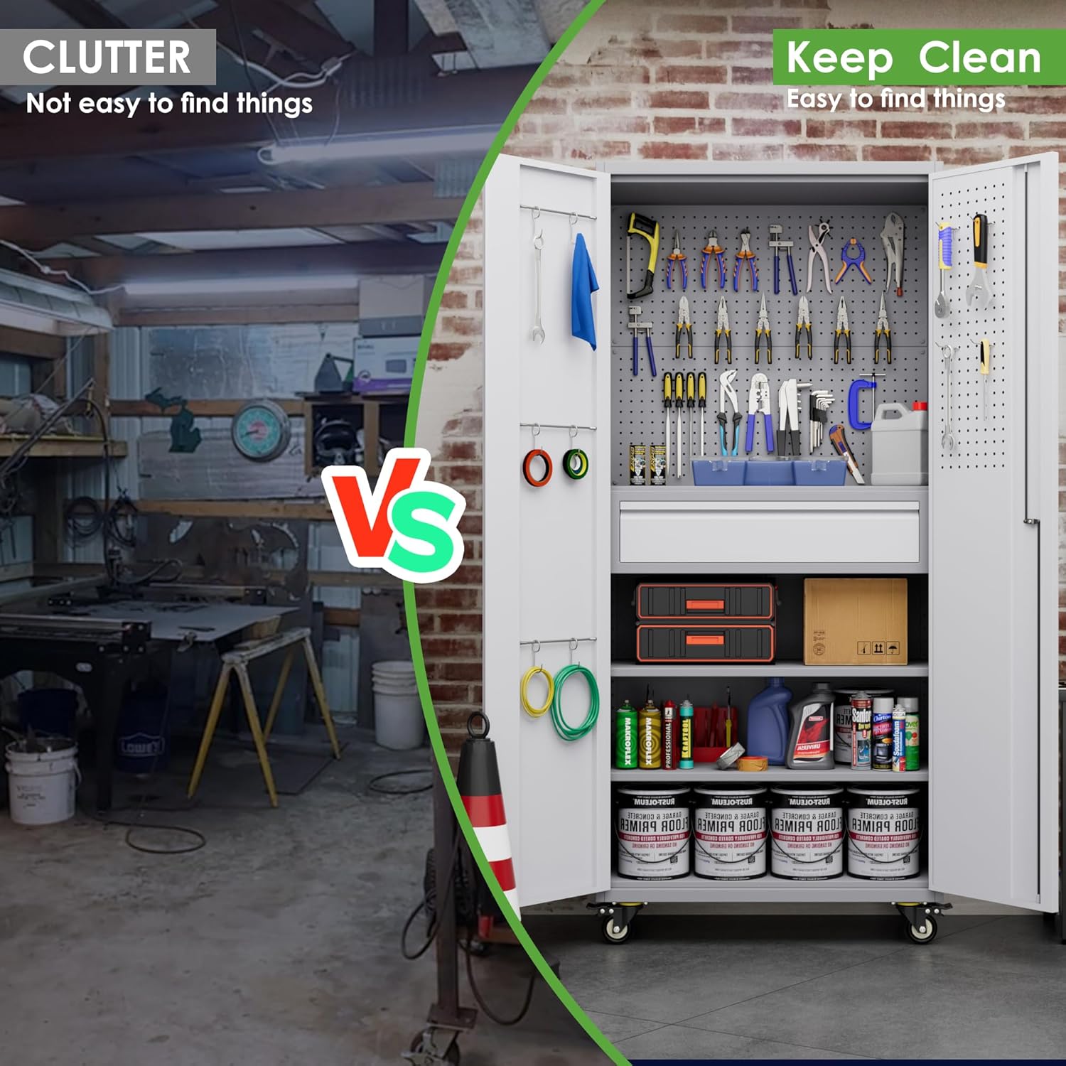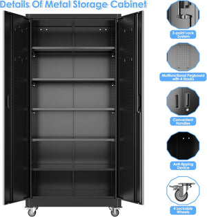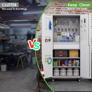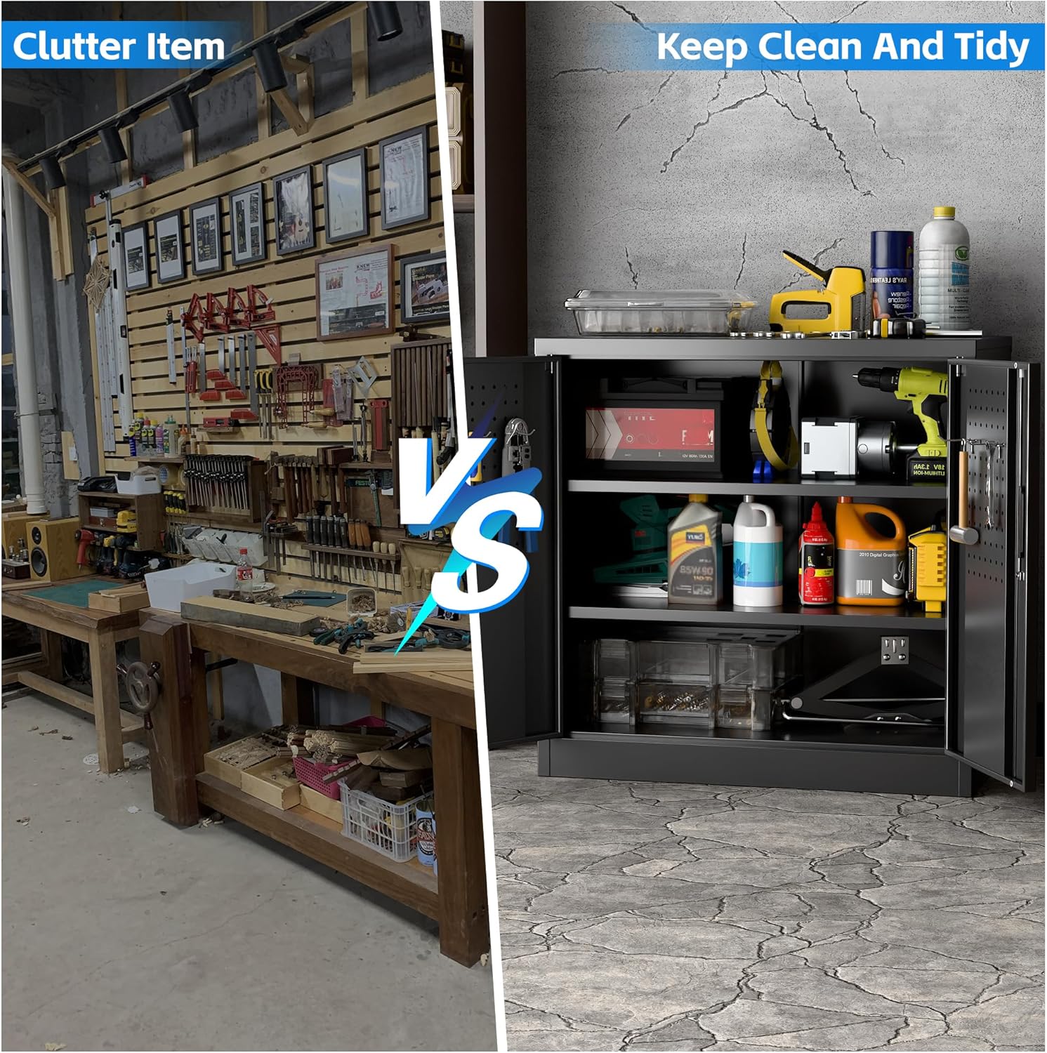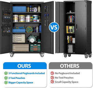 - New Upgrade:Metal Cabinet has lots of room to organize your belongings.In order to meet customer storage requirements, the newly upgraded metal cabinet with Pegboard(Including 4 hooks) for storing tools and other items, fully utilizing space