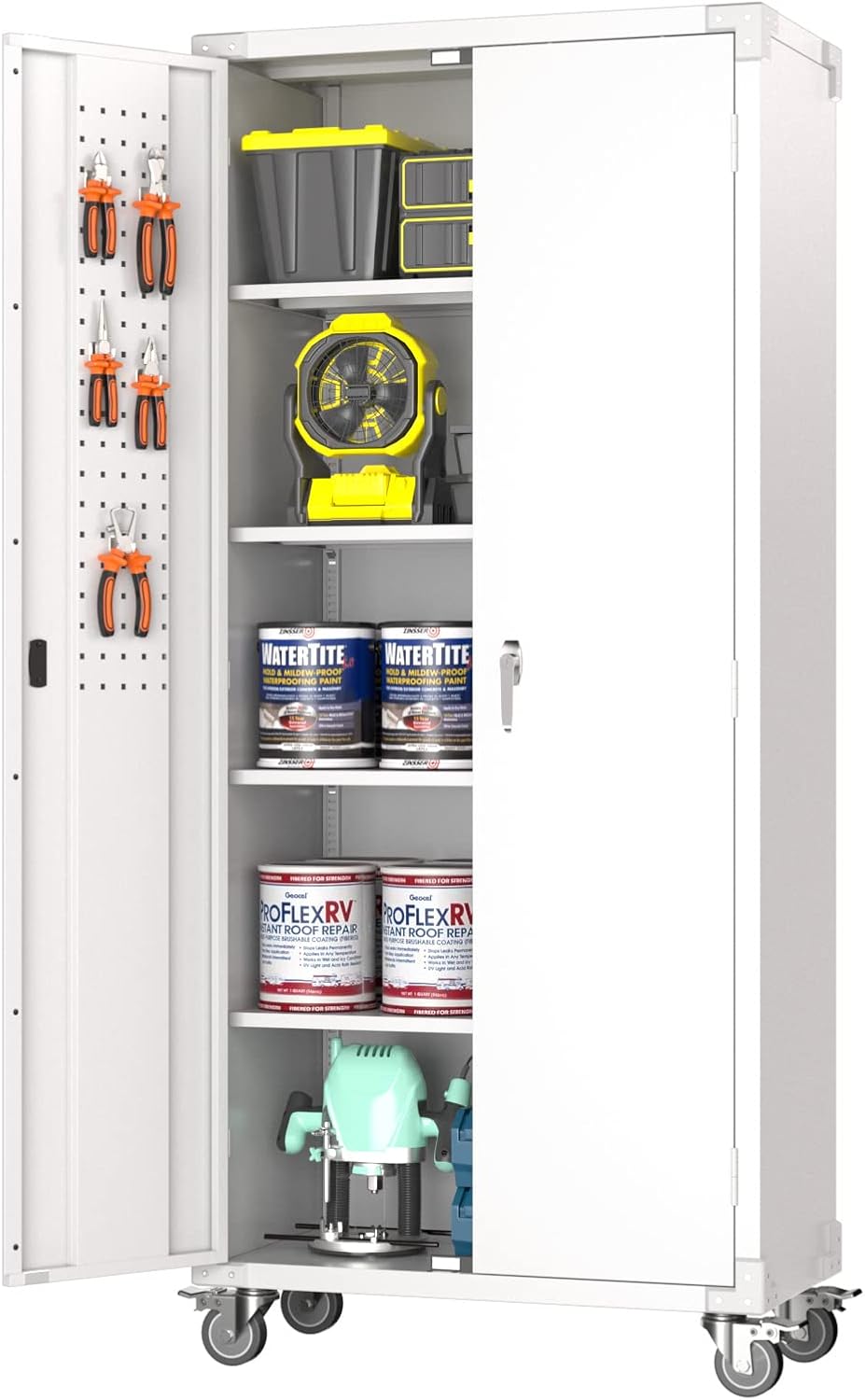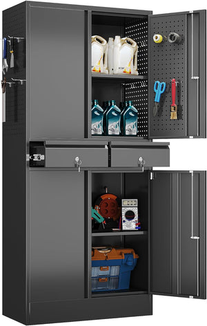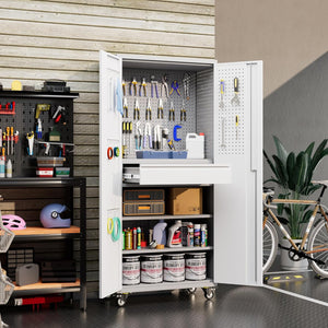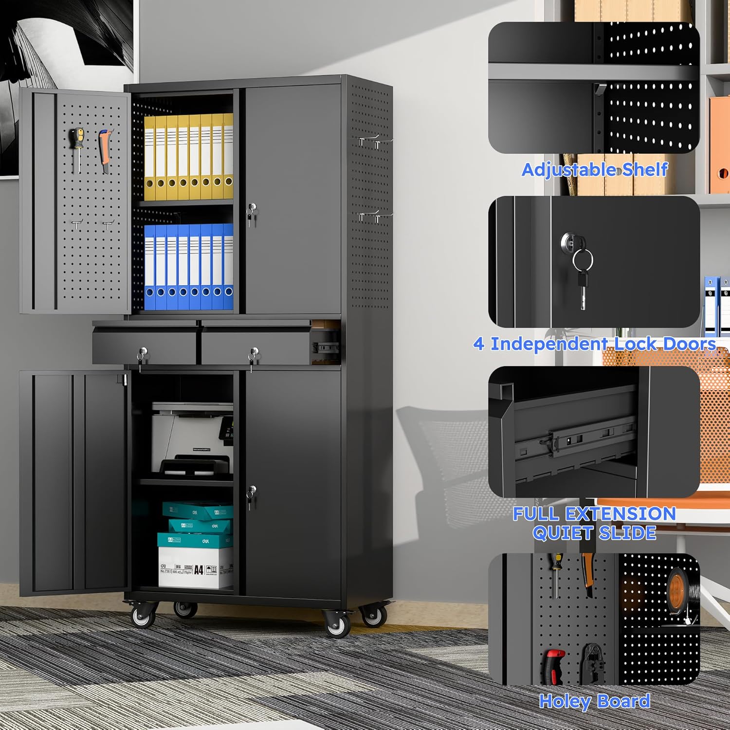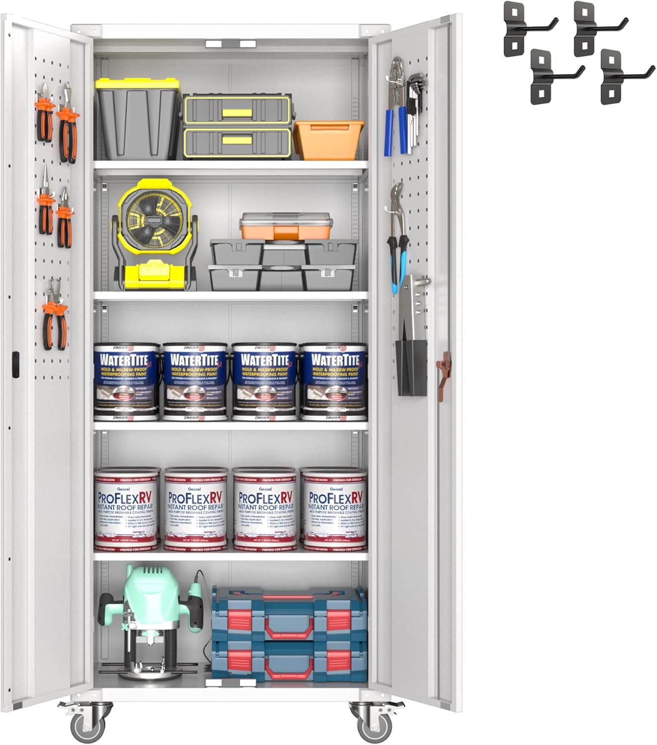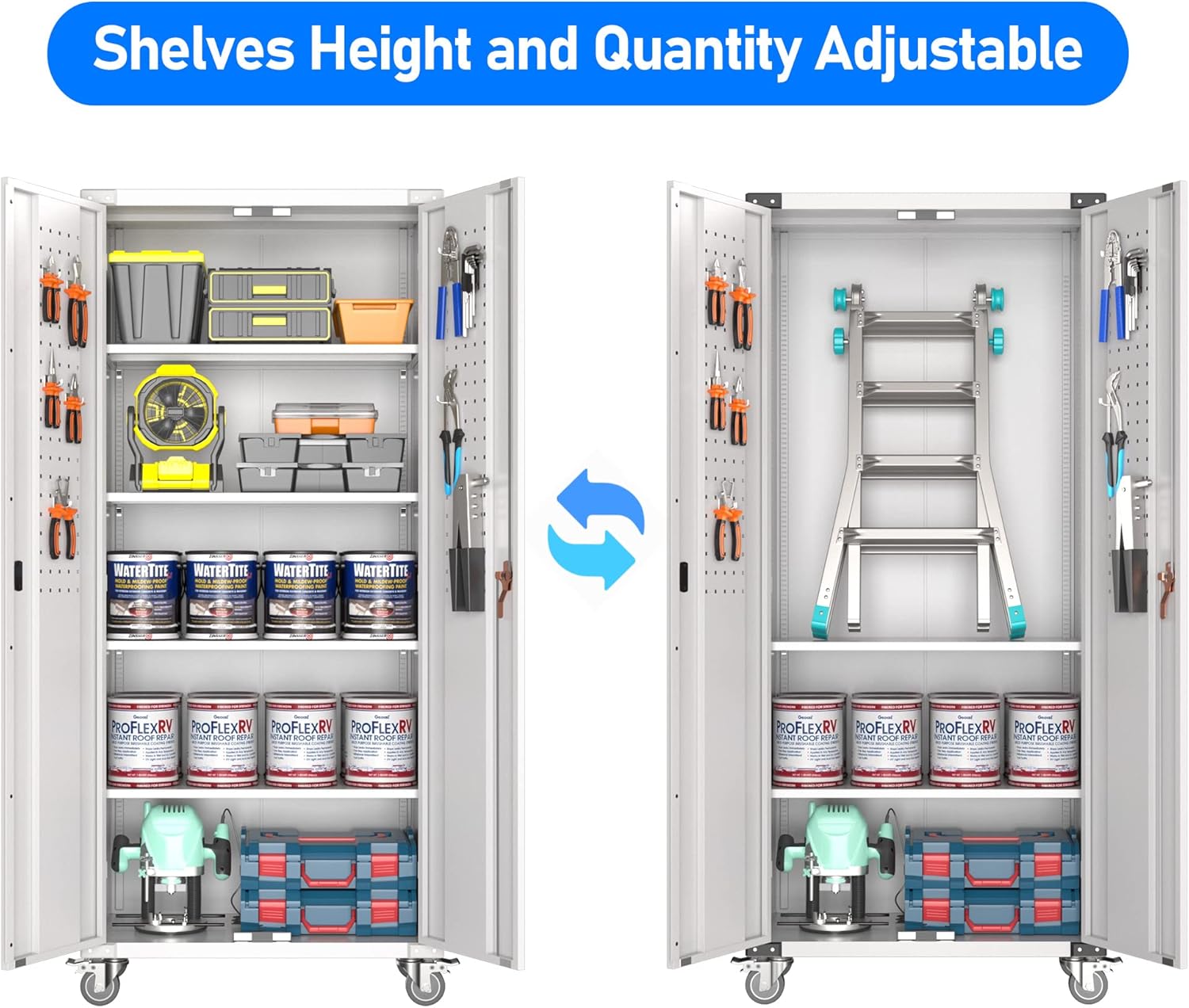 - New Upgrade:Metal Cabinet has lots of room to organize your belongings.In order to meet customer storage requirements, the newly upgraded metal cabinet with Pegboard(Including 4 hooks) for storing tools and other items, fully utilizing space