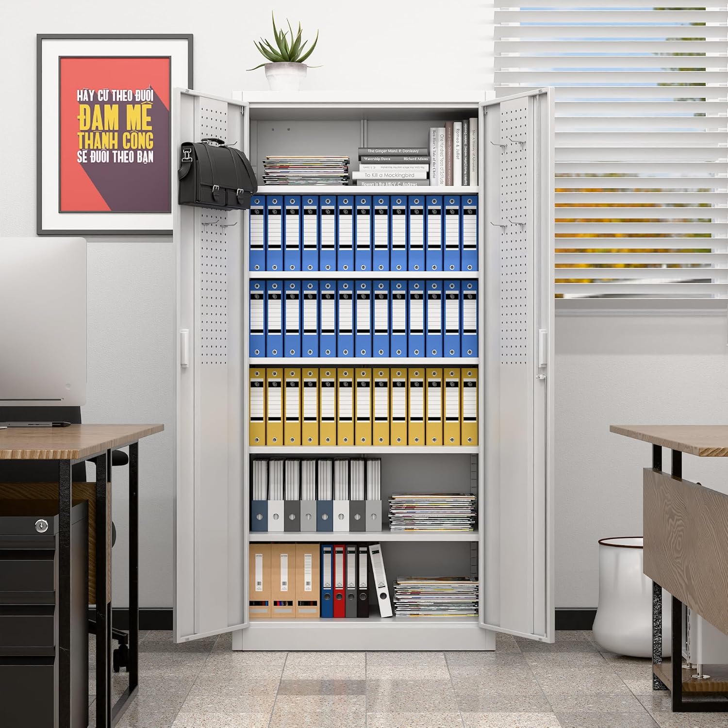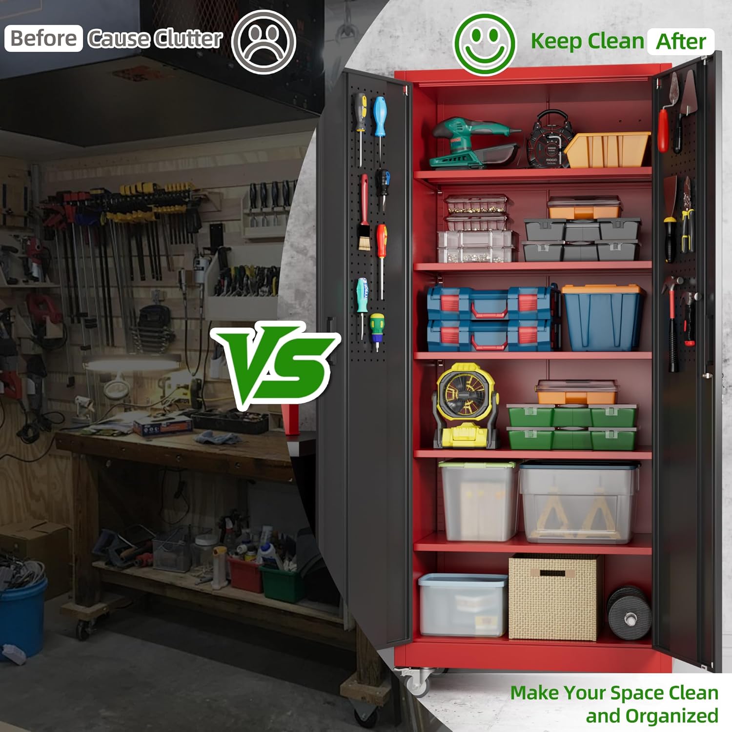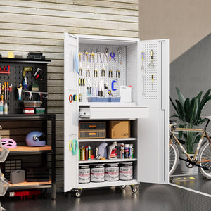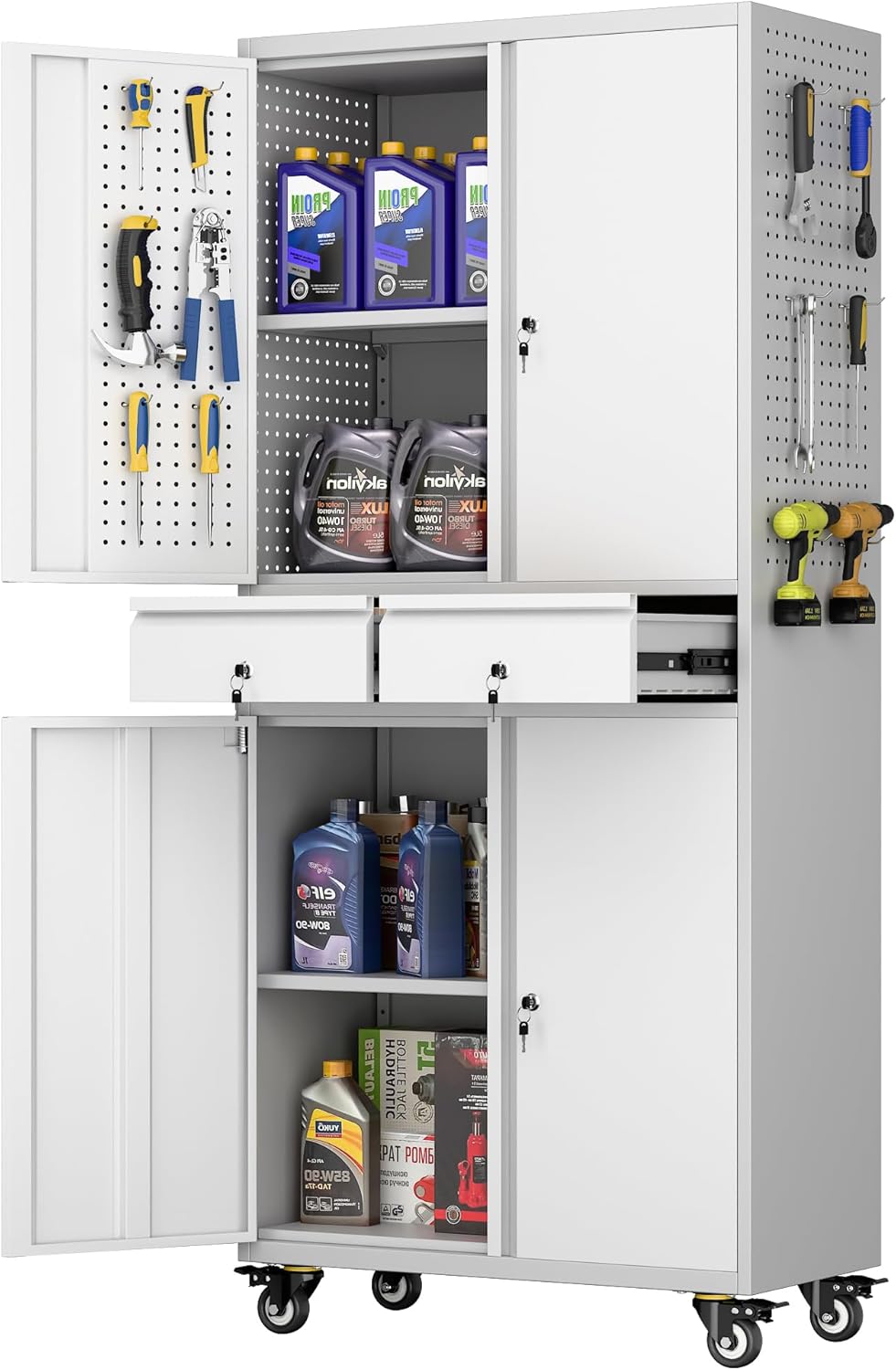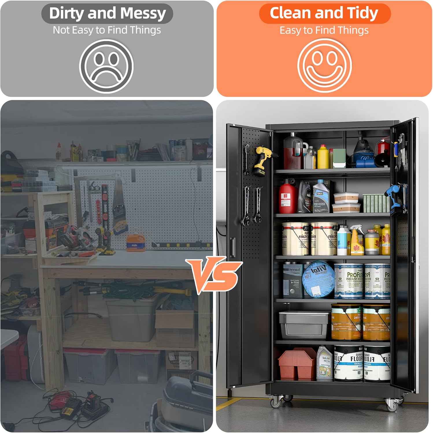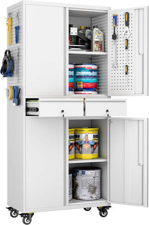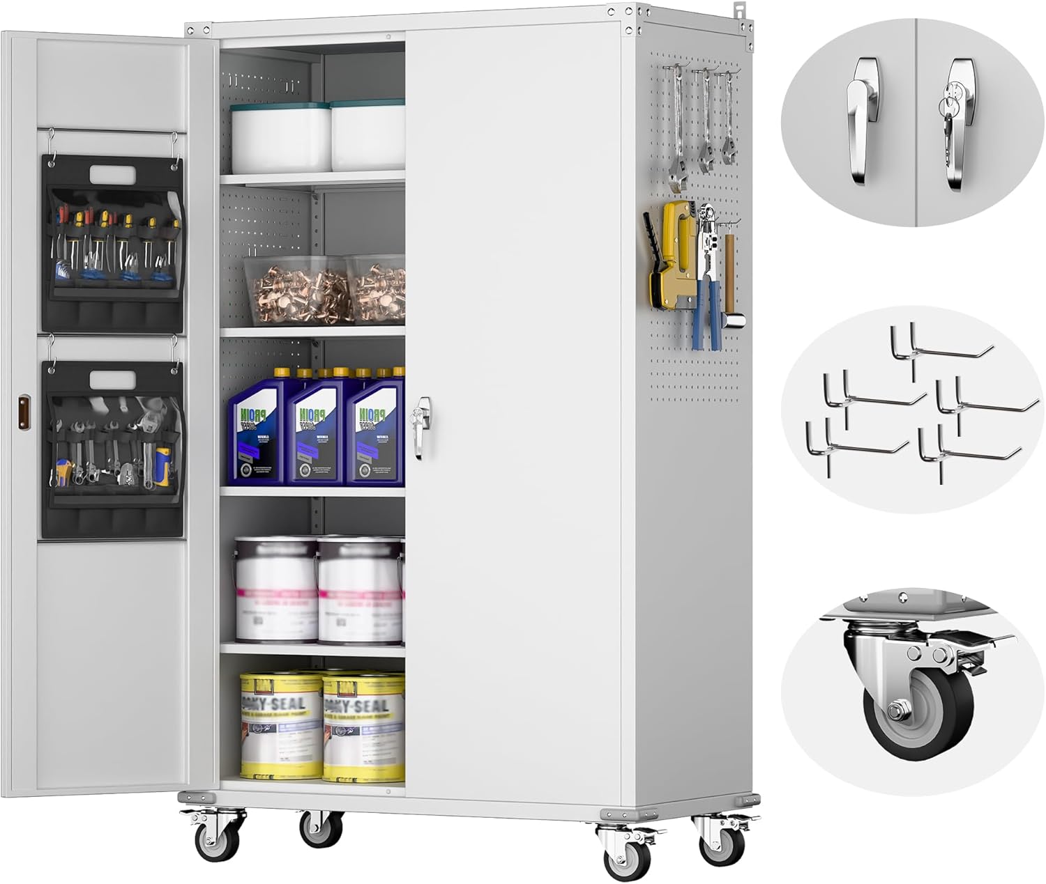 - New Upgrade:Metal Cabinet has lots of room to organize your belongings.In order to meet customer storage requirements, the newly upgraded metal cabinet with Pegboard(Including 4 hooks) for storing tools and other items, fully utilizing space