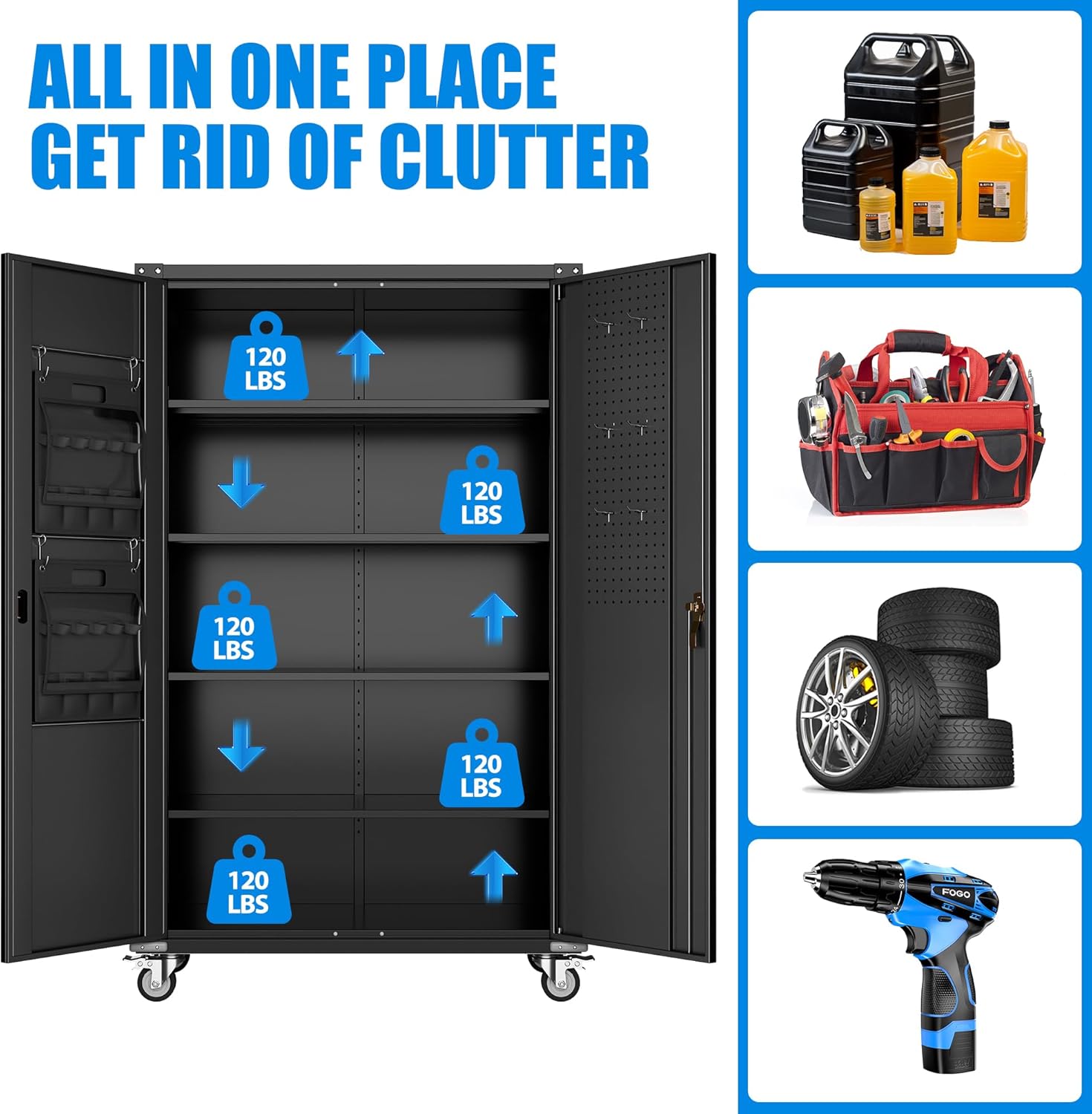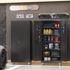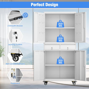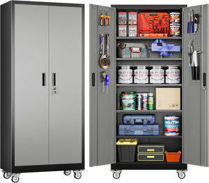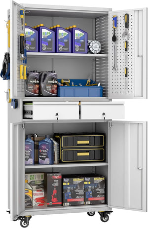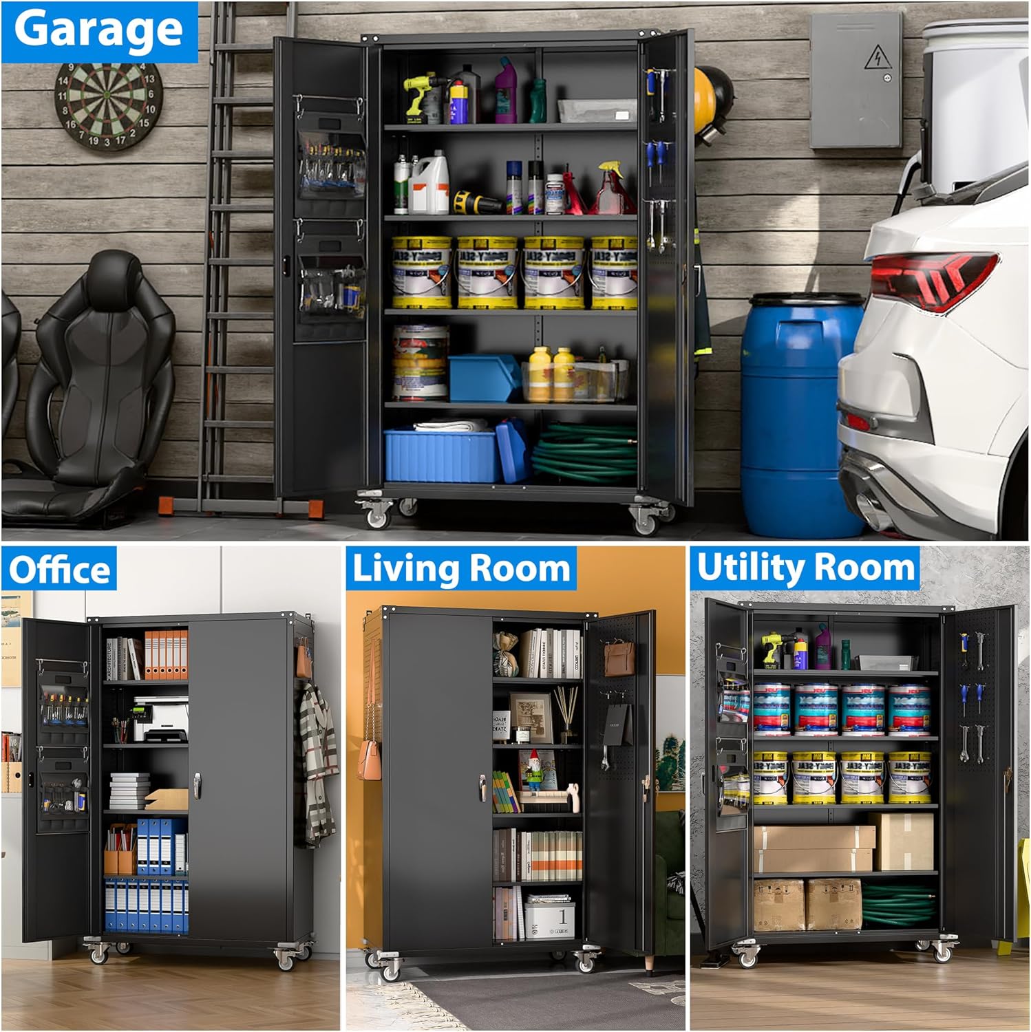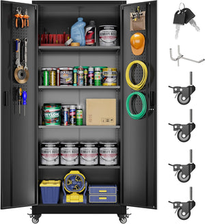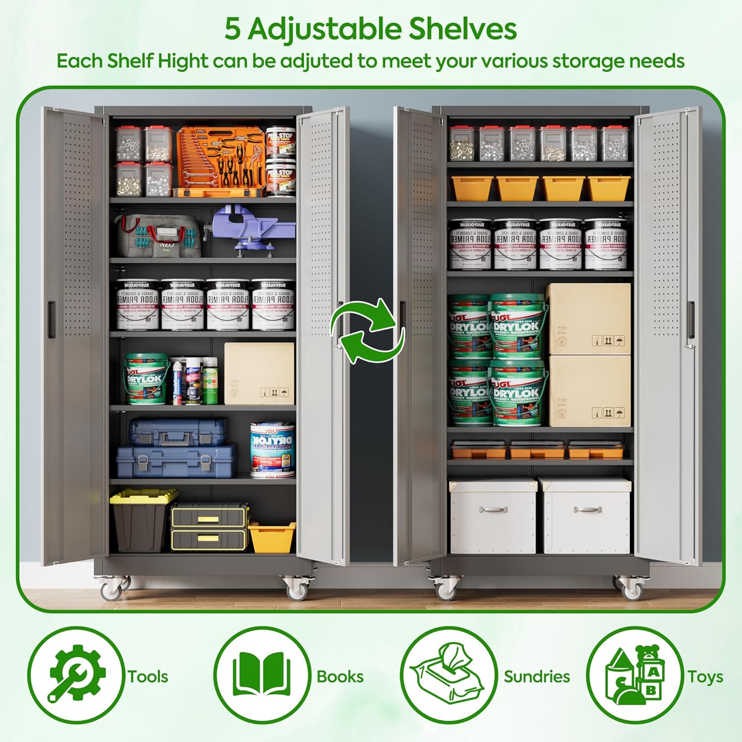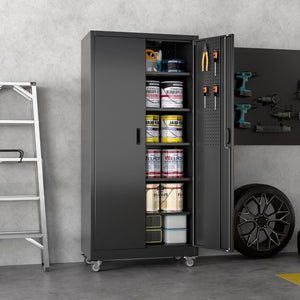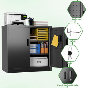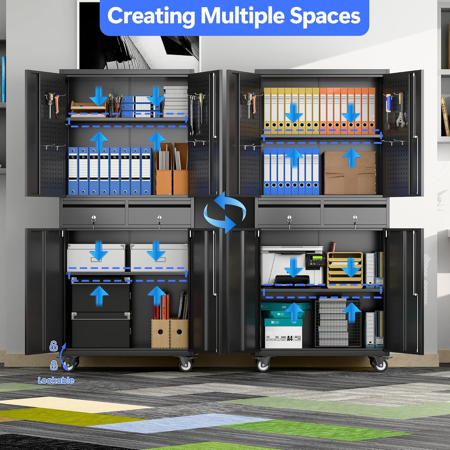 - New Upgrade:Metal Cabinet has lots of room to organize your belongings.In order to meet customer storage requirements, the newly upgraded metal cabinet with Pegboard(Including 4 hooks) for storing tools and other items, fully utilizing space