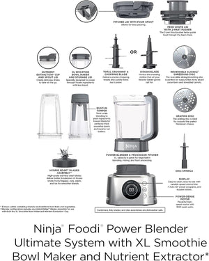 | Included Components | 1600 Peak-Watt Motor Base, 18 oz. XL Smoothie Bowl Maker with Built-in Tamper and Storage Lid, 20 Recipe Inspiration Guide, 24 oz. Nutrient Extraction* Cup, 72 oz. Power Blender & Processor Pitcher, Dough Blade, Feed chute lid with 2-part pusher, Grating Disc, Hybrid Edge Blades Assembly, Reversible Slicing/Shredding Disc, Total Crushing & Chopping Blade Assembly |
