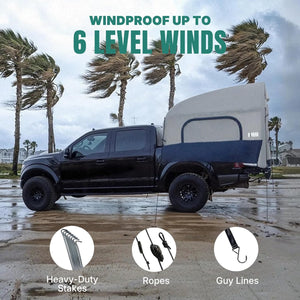- 【All-Weather Protection】Niphean tent for truck bed is made with PU3000mm waterproof fabric and features a built-in rainfly, ensuring you stay dry during heavy rain.The dual anchoring system (ground stakes + wind ropes) enhances stability, handling winds up to 6 levels. When fully inflated and secured in the truck bed, the tent remains stable even while driving at low speeds.