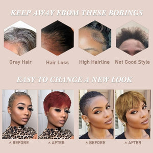 - Kindly Reminder: 1. The picture shown is the original look of the product. But due to the package and long transportation, pixie cut wig human hair you receive may not look so good. Don’t worry and take a few minutes to style it as the picture shows. 2. The pixie wig made by hand may exists some floating hair, which it’s normal phenomenon, no shedding hair, no tangle, you can reassure to use.