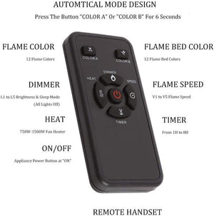 - Multi Operation Modes: Touch screen and remote control;12 flame & LED flame bed color modes;5 flame speed modes;5 flame brightness levels; Specially automatic flame design(the flame color and brightness changed