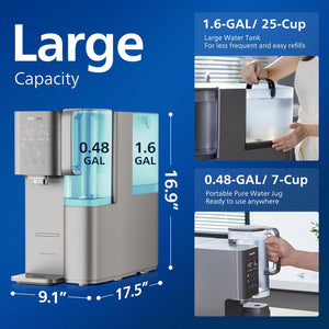 - ๐๐ฅ๐ฎ๐ ๐๐ง๐ ๐๐ฅ๐๐ฒ: Enjoy instant filtration with a simple press of a button, making it convenient and easy to access clean water. Just plug and play, no plumbing installation required.This water dispenser consistently dispenses a standard volume of 16.9 oz with each press, ensuring you can enjoy pure and fresh-tasting water instantly