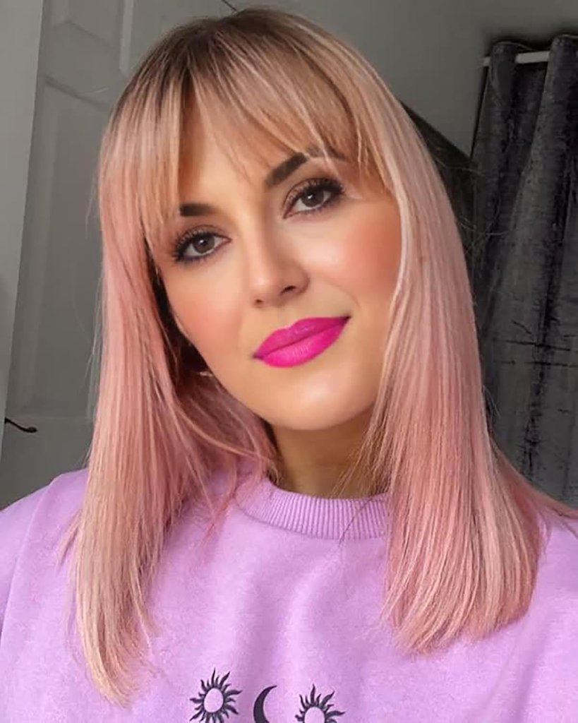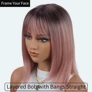 - The classic Bob with bangs hairstyle matches the inner button to the chin. The whole hairstyle is layered, and it looks capable with a touch of nifty