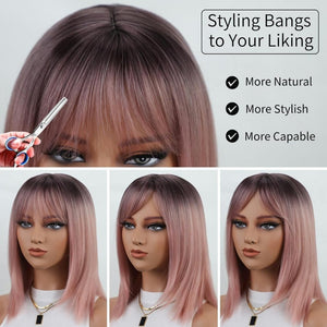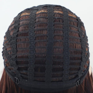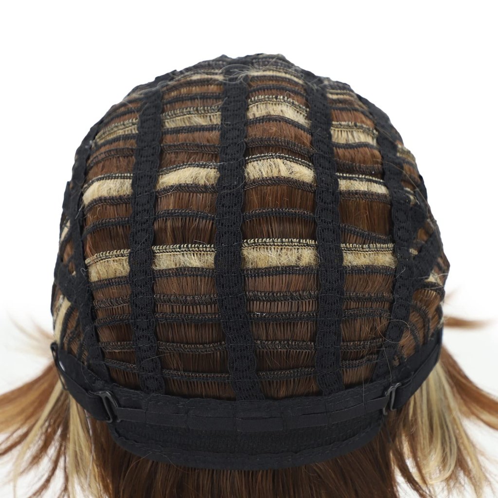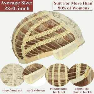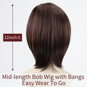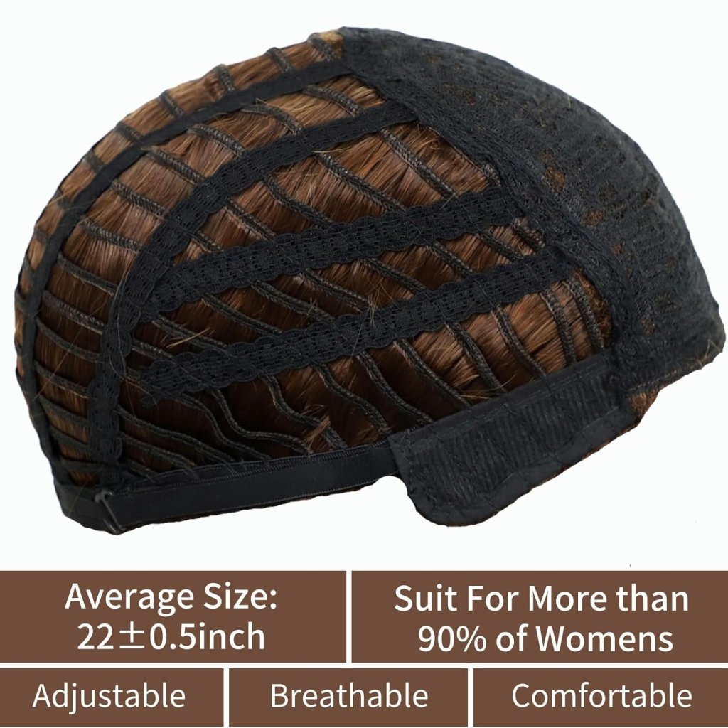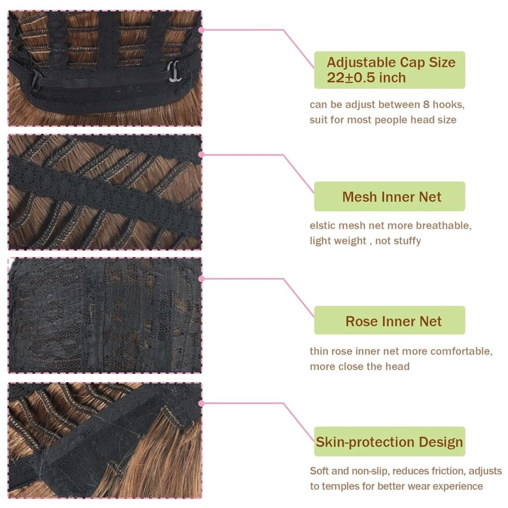 - The brown bob with bangs is average size wig, suitable for women with head circumference of 21-23inch. The front net adopts rose network, and the back net adopts elastic band network. Two elastic bands can adjust the tightness between 8 gears, wear it more comfortable and breathable