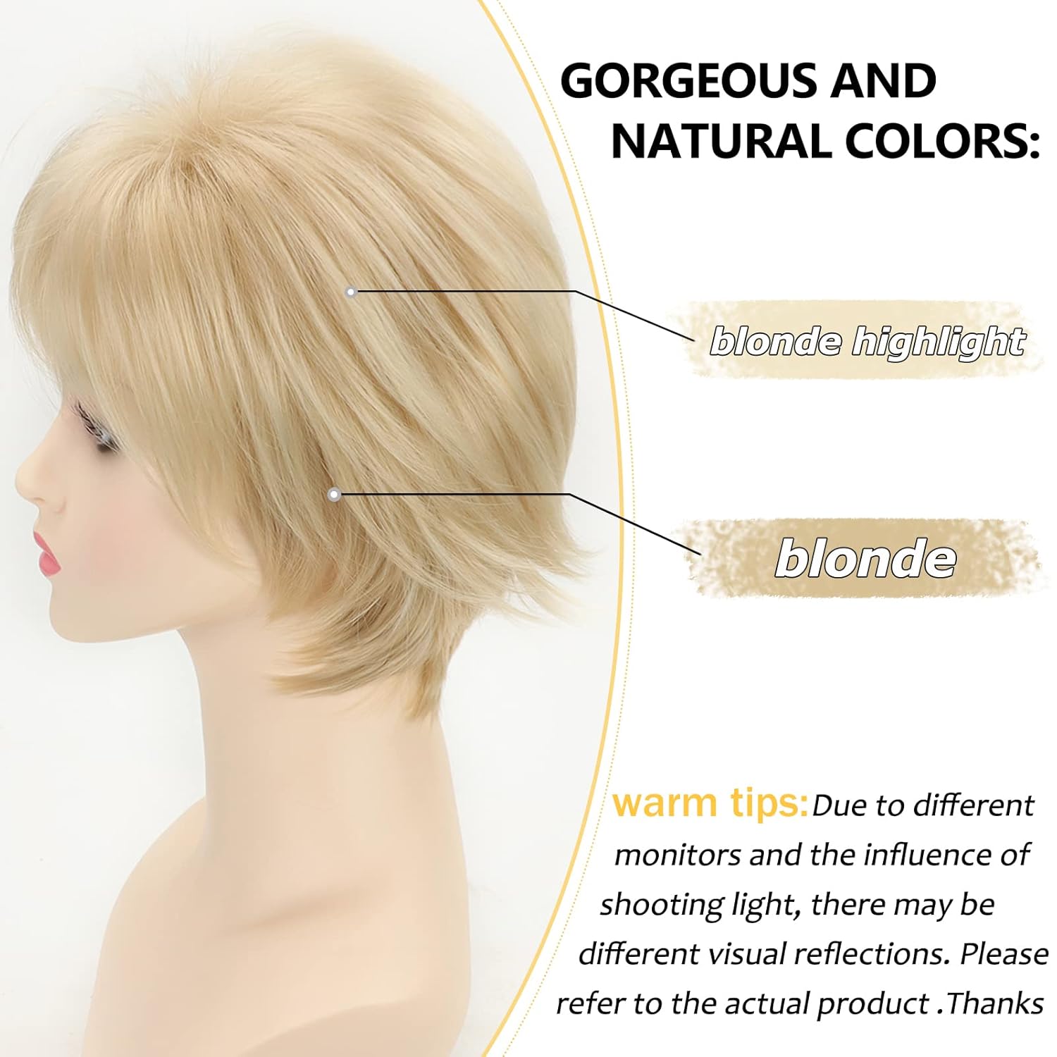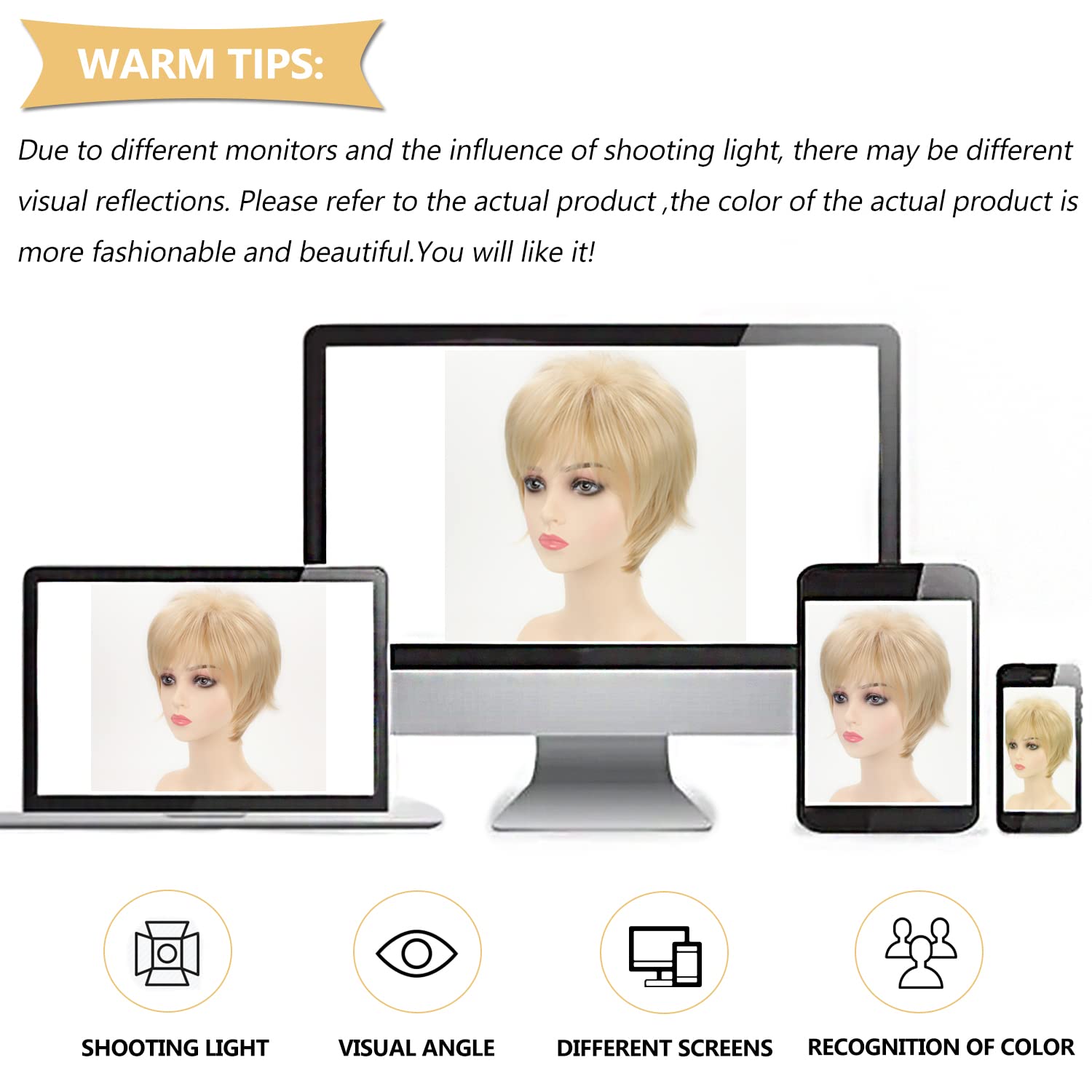 - Color: Dark brown mixed creamy white or blonde(As the photo color) , The color of the short wig will match your complexion color, make you more beautiful and sexy.Due to the differences in manual machine production, shooting lighting, display and personal understanding, the color and details may be slightly different, please understand, we will try our best to improve