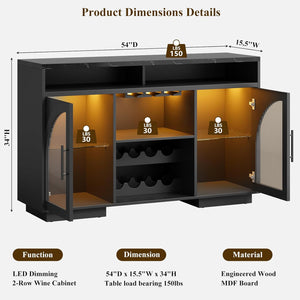 Sideboard Buffet Cabinet, 54" Kitchen Cabinet with LED Lights & Arched Glass Doors, Tall Bar Cabinets with 2 Adjustable Shelves, Wine Rack & Storage Table for Dining Room, Black