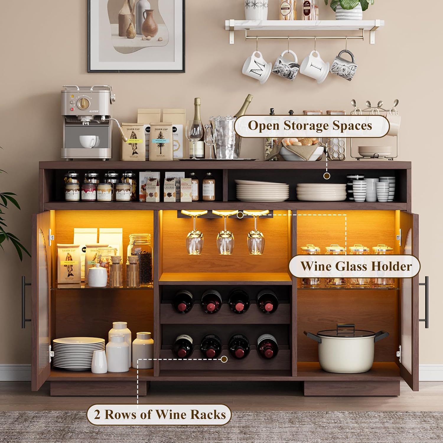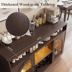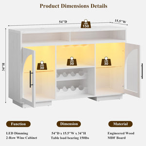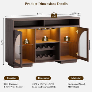 - Spacious & Organized Storage: This buffet sideboard offers ample space, measuring 54"L x 15.5"W x 34"H. It includes 2 open wine racks, adjustable shelves behind glass doors, and 3 open compartments—perfect for storing coffee makers, cups, jars, and kitchen essentials. The sideboard-style design keeps your items neatly arranged while adding a touch of modern storage elegance to any entertaining space