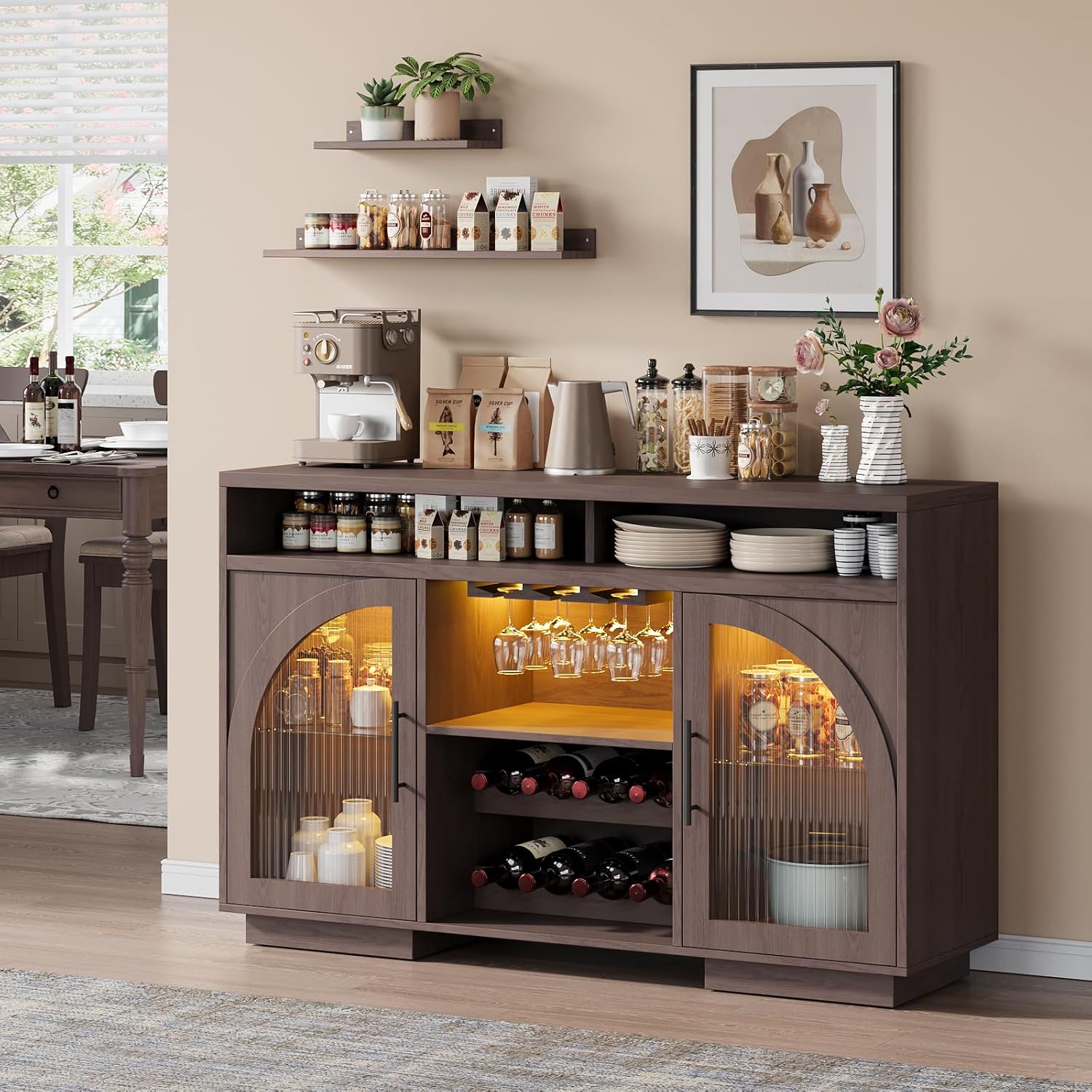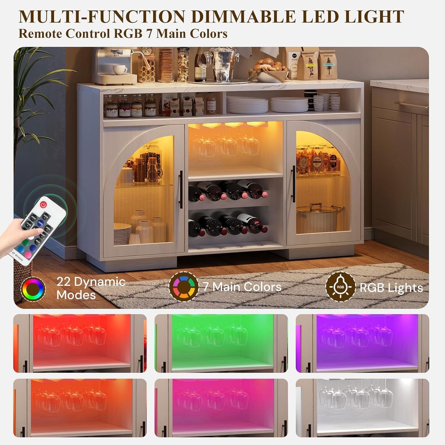 - Stylish LED Illuminated Bar Cabinet: Transform your space with this stunning buffet unit, featuring customizable RGB LED lights (7 colors, 22 modes, and adjustable brightness). Perfect as a coffee bar cabinet or liquor cabinet, the soft glow highlights wine bottles and glassware, creating a luxurious ambiance for entertaining. The modern design with arched glass doors adds elegance, making it ideal for living spaces, dining areas, or home bars