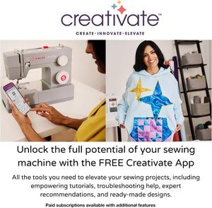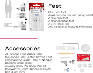 | Included Components | Included Accessories: All-Purpose Foot, Zipper Foot, Buttonhole Foot, Button Sewing Foot, Seam Ripper / Lint Brush, Quilting Guide, Needles, Bobbins, Screwdriver, Auxiliary Spool Pin, Spool Pin Felt, Soft-Sided Dust Cover. |