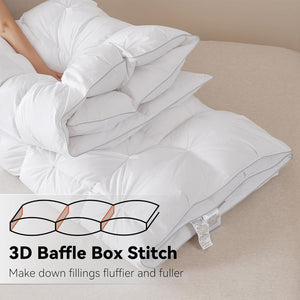 - Made to Last: 3D baffle box construction distributes down and feather evenly inside the comforter, preventing the filling from shifting or clumping, keeping you warm from head to toe. 8 corner tabs help the comforter easily attach duvet cover and hold it in place.Together with the high-density fabric and double-needle stitching, you don’t need to worry about filling leakage