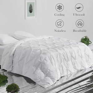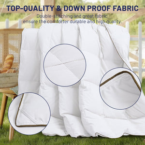 - Superb Down Proof Fabric: this down filled comforter is made with 400 Thread Count breathable fabric. It makes our comforter not only soft, but also noiseless, helping create a cozy sleeping environment. Durable enough, this down filled comforter has a long service life, freeing you from worrying about it tearing off or fading away easily