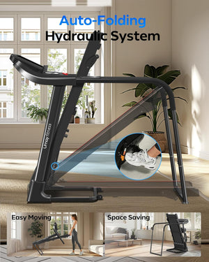 - 𝐅𝐎𝐋𝐃𝐈𝐍𝐆 𝐓𝐑𝐄𝐀𝐃𝐌𝐈𝐋𝐋 - The hydraulic system guarantees safe and hands-free unfolding. Say goodbye to concerns about scuffing your floors when lowering the treadmill's base. The built-in transportation wheels allow for effortless movement or storage.