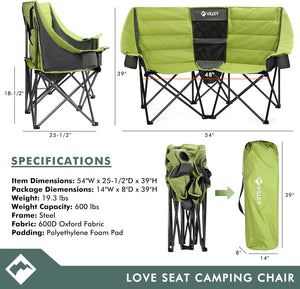 - PORTABILITY MADE EFFORTLESS — Lightweight at 19.3 lbs, this loveseat camping chair can be easily folded into a compact size of 14"W x 8"D x 39"H, making it effortless to store and transport to any outdoor activity or occasion
