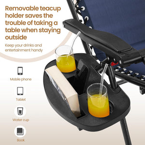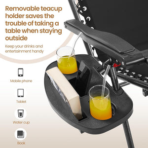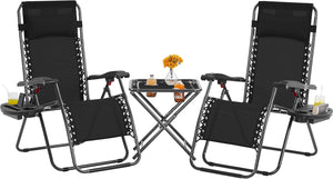 - Come with Cupholders: Each Each folding recliner is provided with a detachable tray, capable of holding 1 phone, 1 pad, and 2 cups or bottles. The 50 cm L × 50 cm W × 50.5 cm Height side table also comprises 2 cupholders. With this outdoor furniture set, your belongings can be kept easily accessible