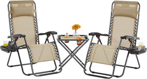 Yaheetech 3PCS Zero Gravity Recliner Portable Outdoor Reclining Chair Set w/Side Table Folding Chaise Lounge Chairs for Patio Beach Deck Garden Pool Beige